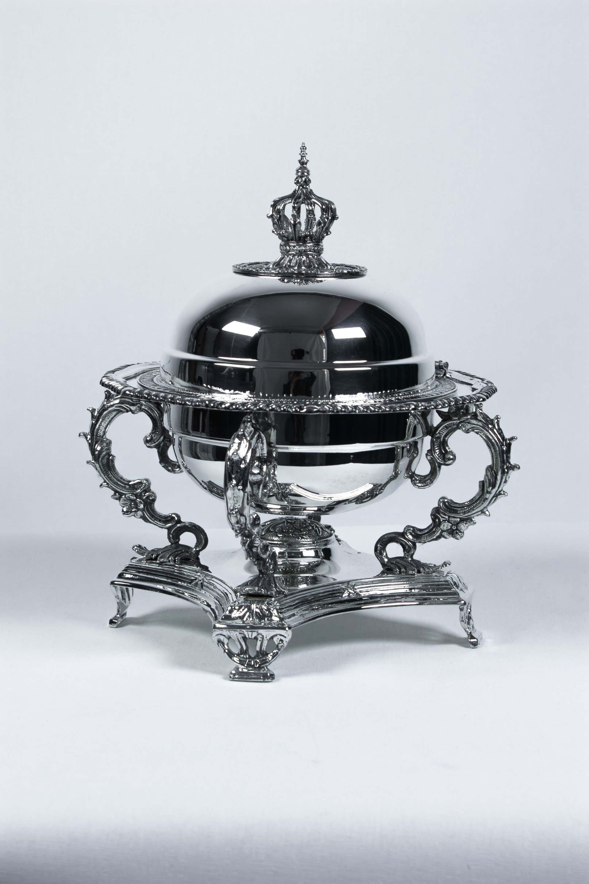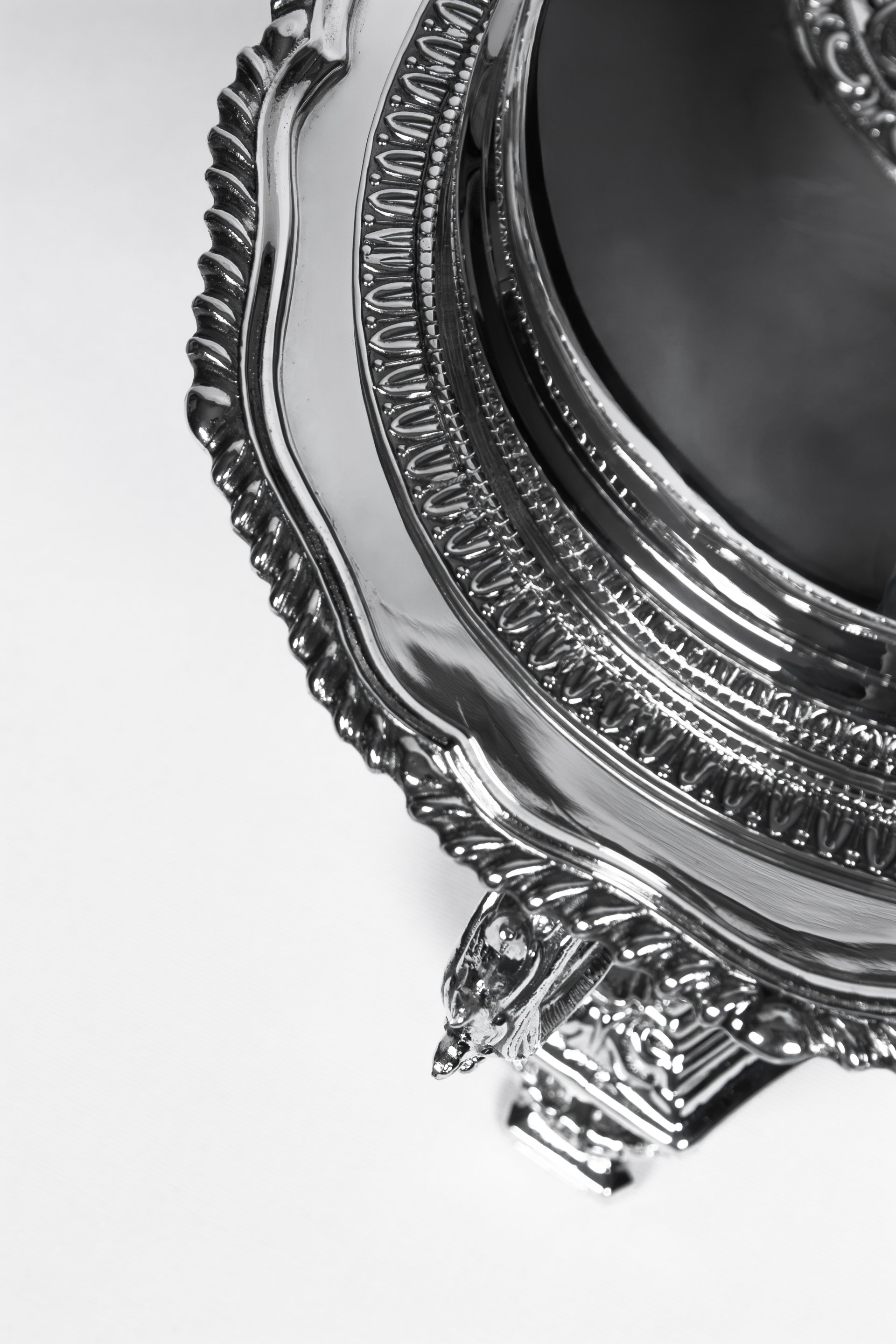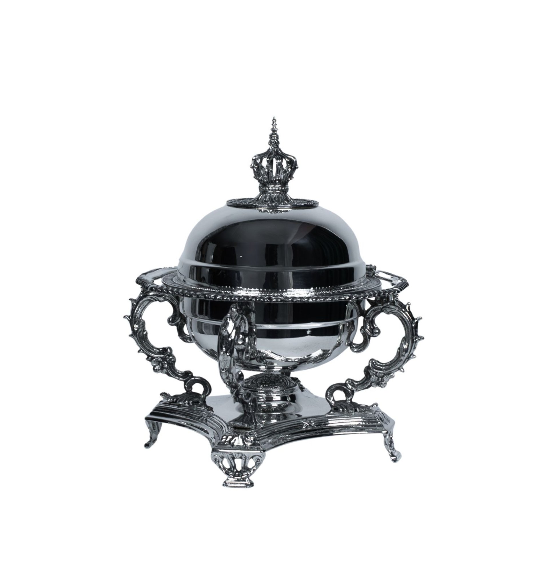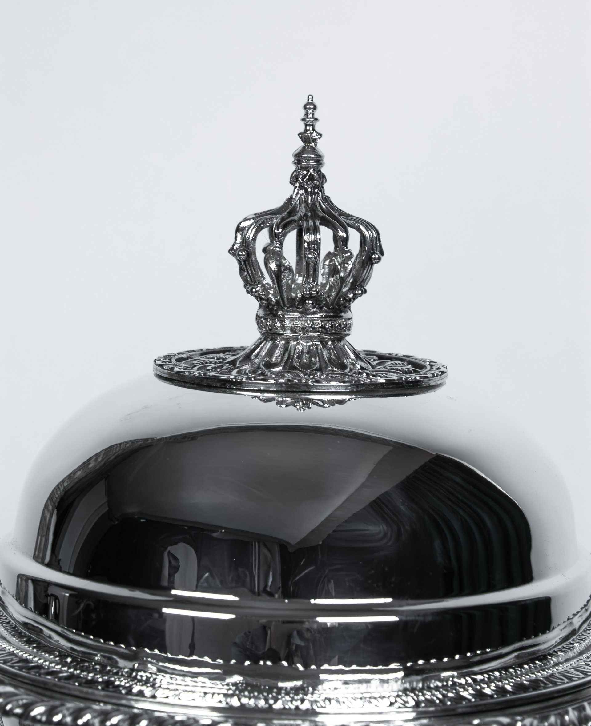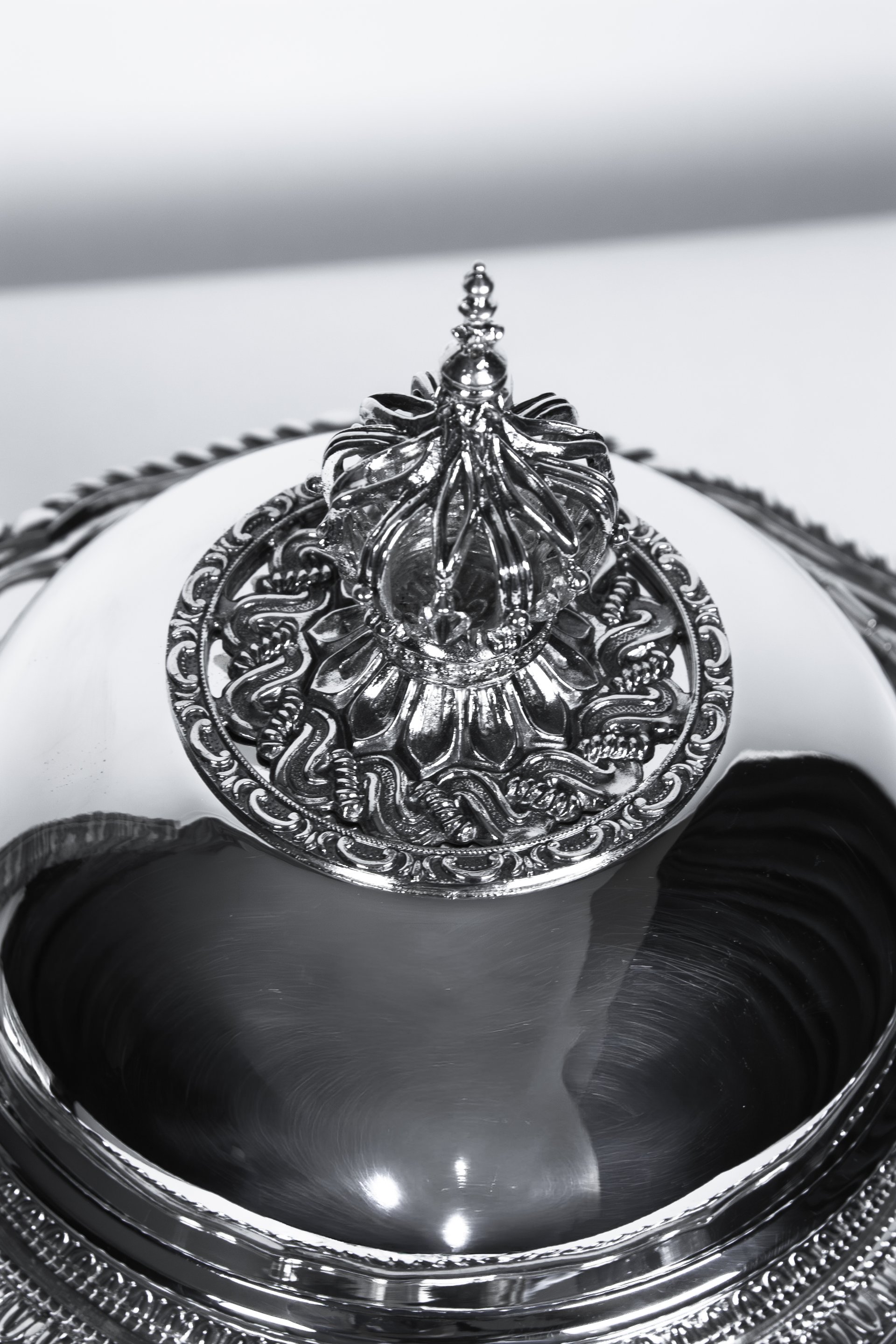 This handmade caviar stand is designed to create an impressive presentation with its sculptural pedestal base and dome lid finished with a crown shaped handle. Crafted from brass and coated with silver plating, it combines decorative detailing with practical serving functionality. Inside the main serving body, one large glass bowl is accompanied by three smaller removable bowls for organized gourmet presentation.