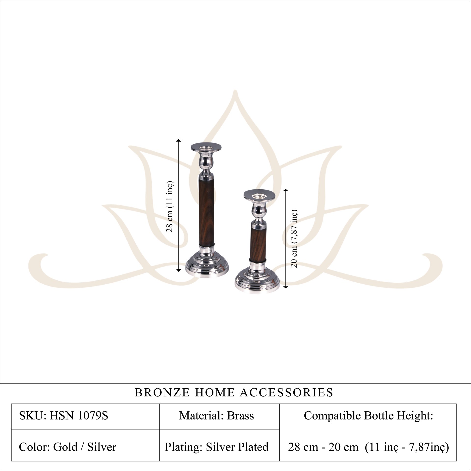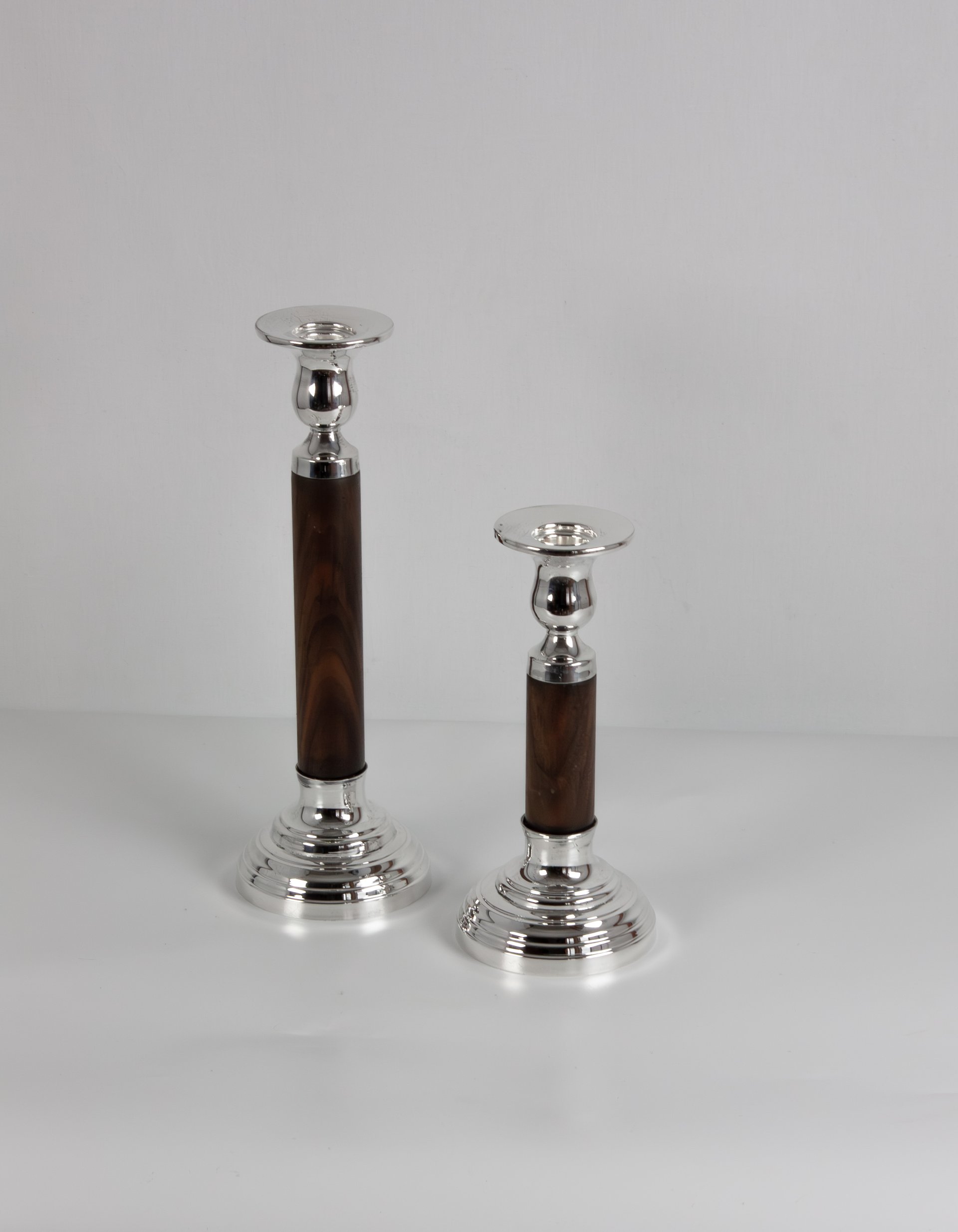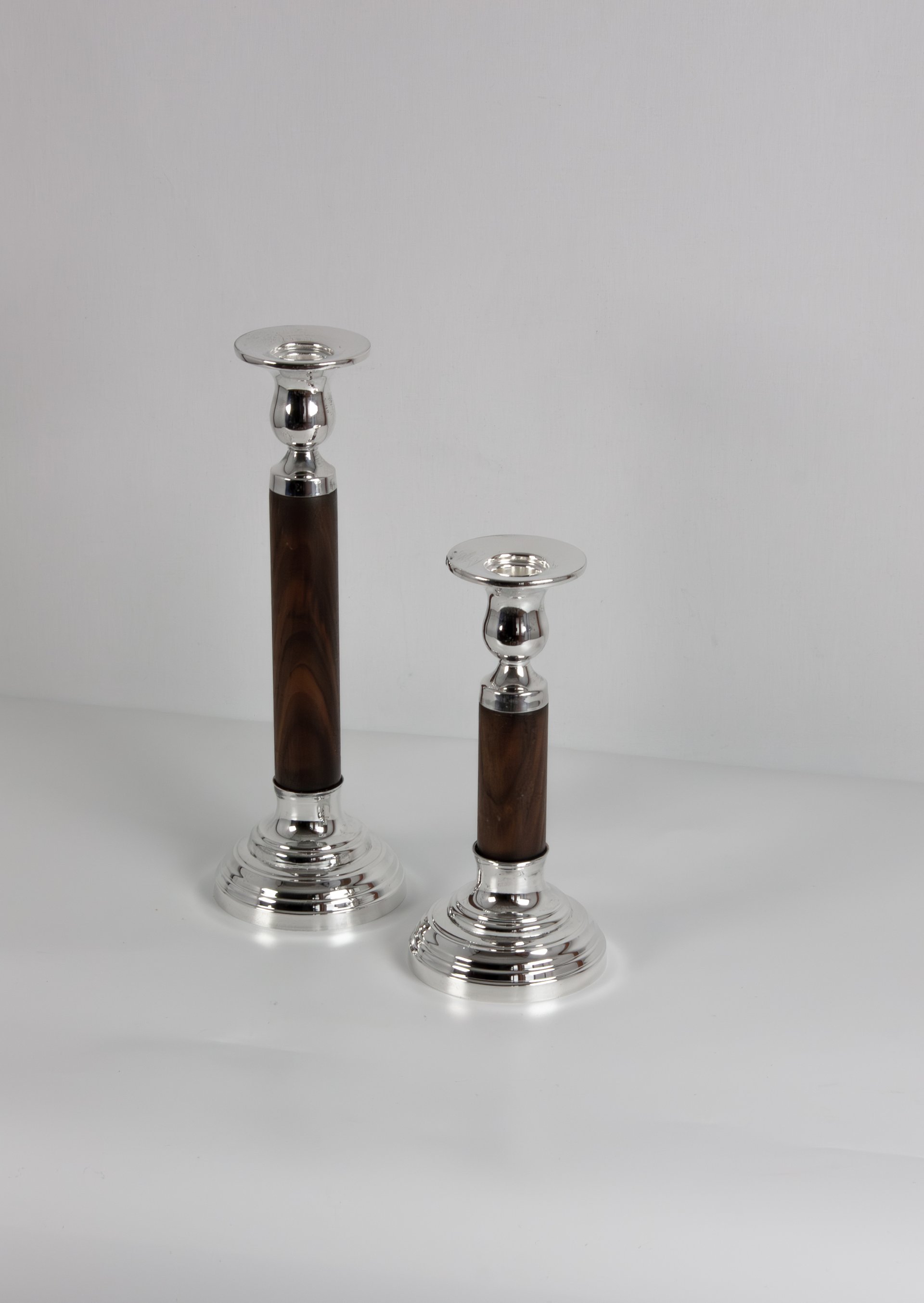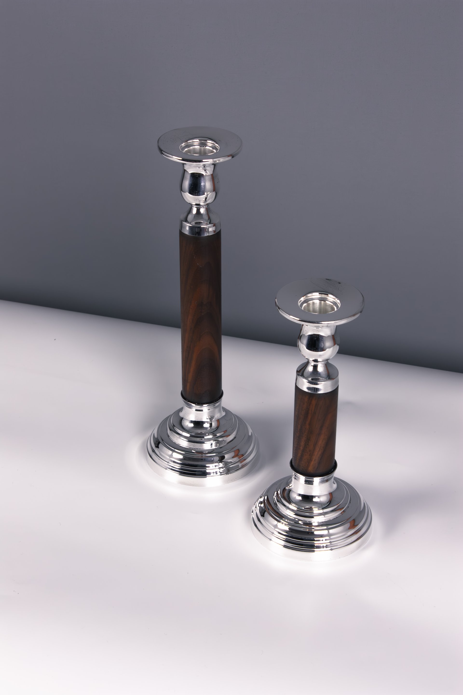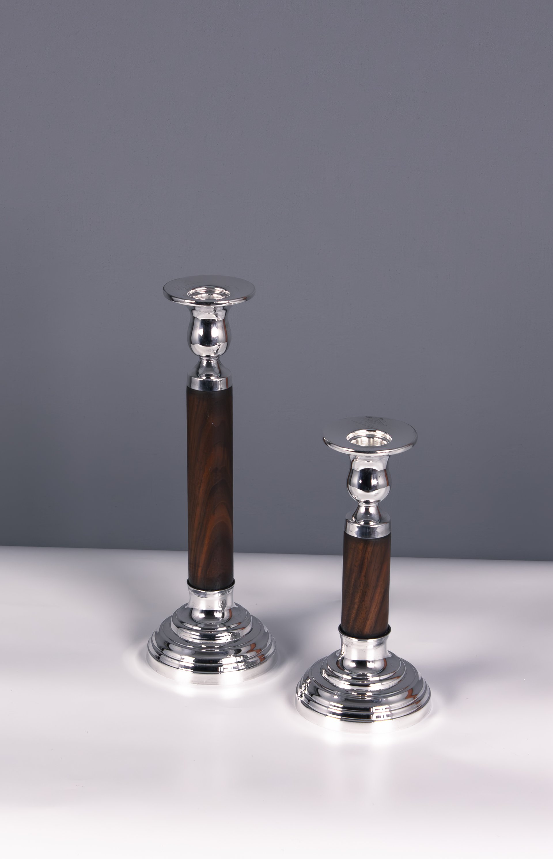 The design features a refined pedestal base and a slender wooden body that enhances the candlestick’s graceful silhouette. The contrast between the polished metal elements and the rich wooden stem makes the set suitable for both traditional and contemporary interiors.