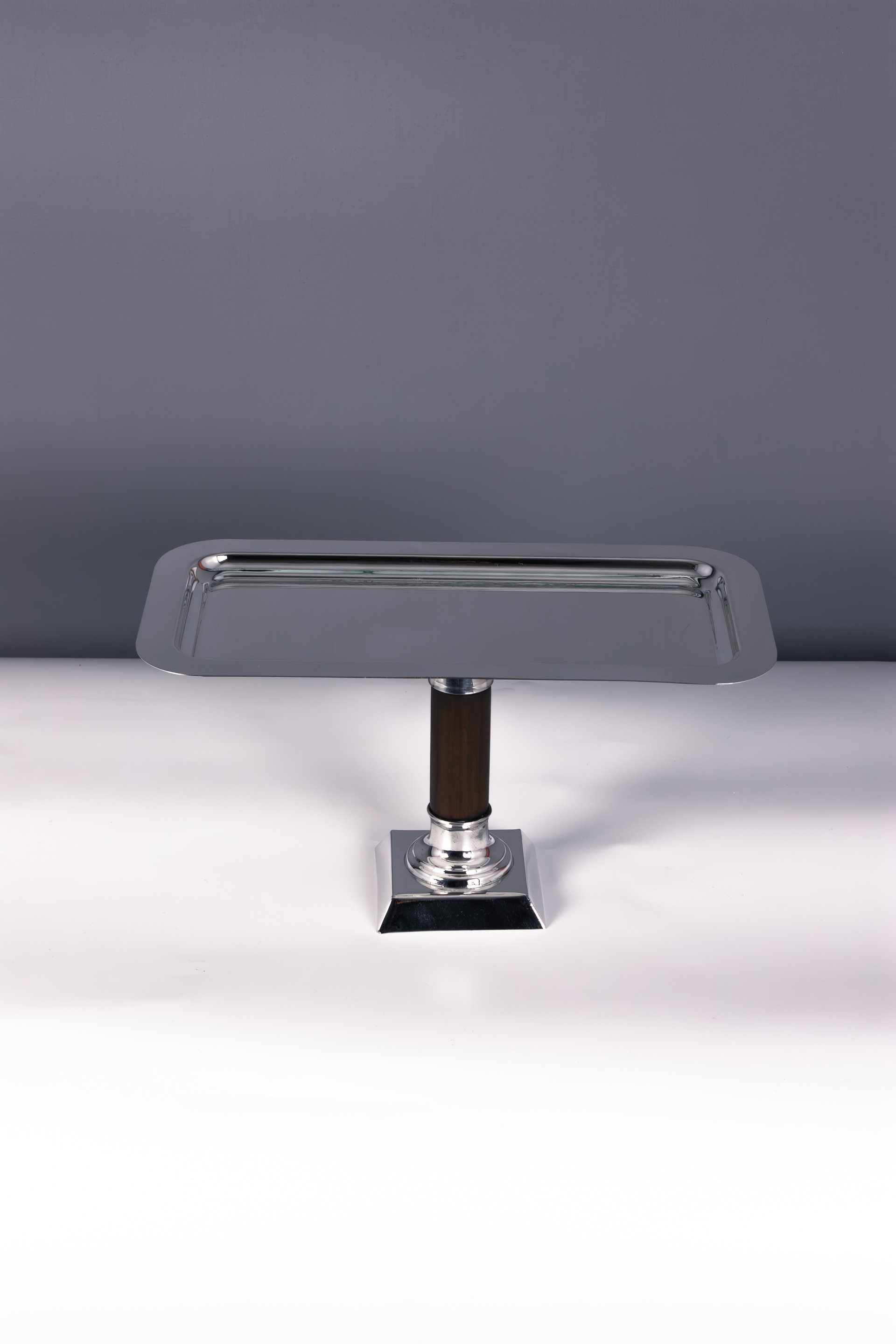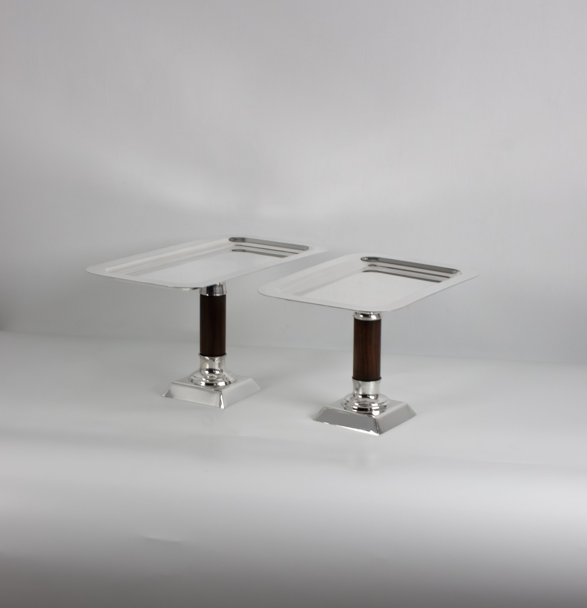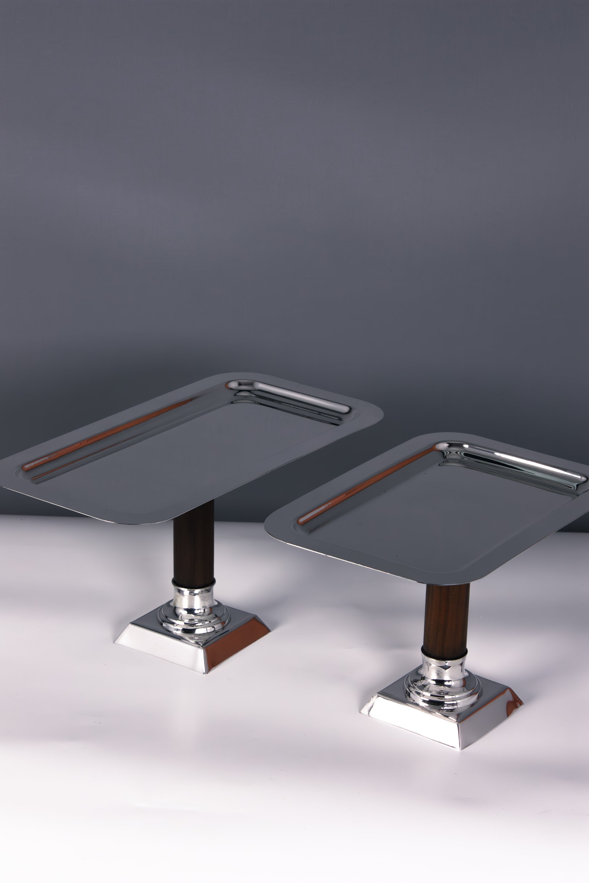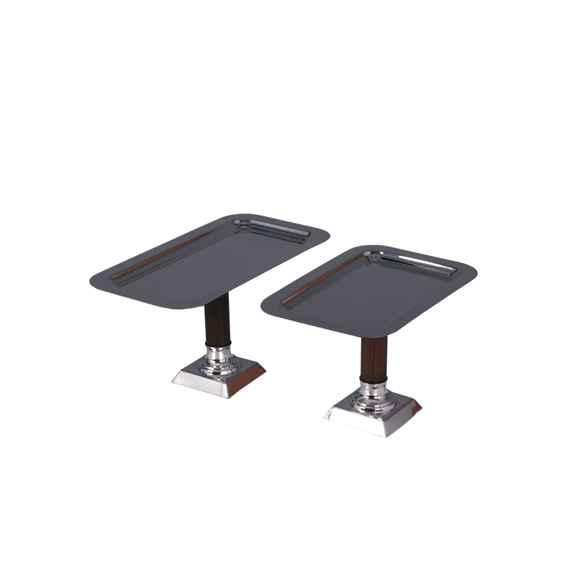 This sophisticated cake and pie stand set is handcrafted from solid brass and designed to elevate the presentation of desserts, pastries and baked goods. The stands feature sleek rectangular serving surfaces supported by elegant wooden stems and polished brass bases, creating a refined balance between natural texture and luxurious metal craftsmanship.