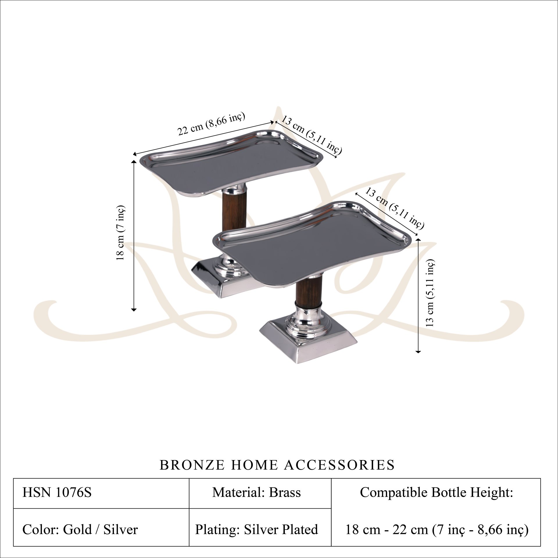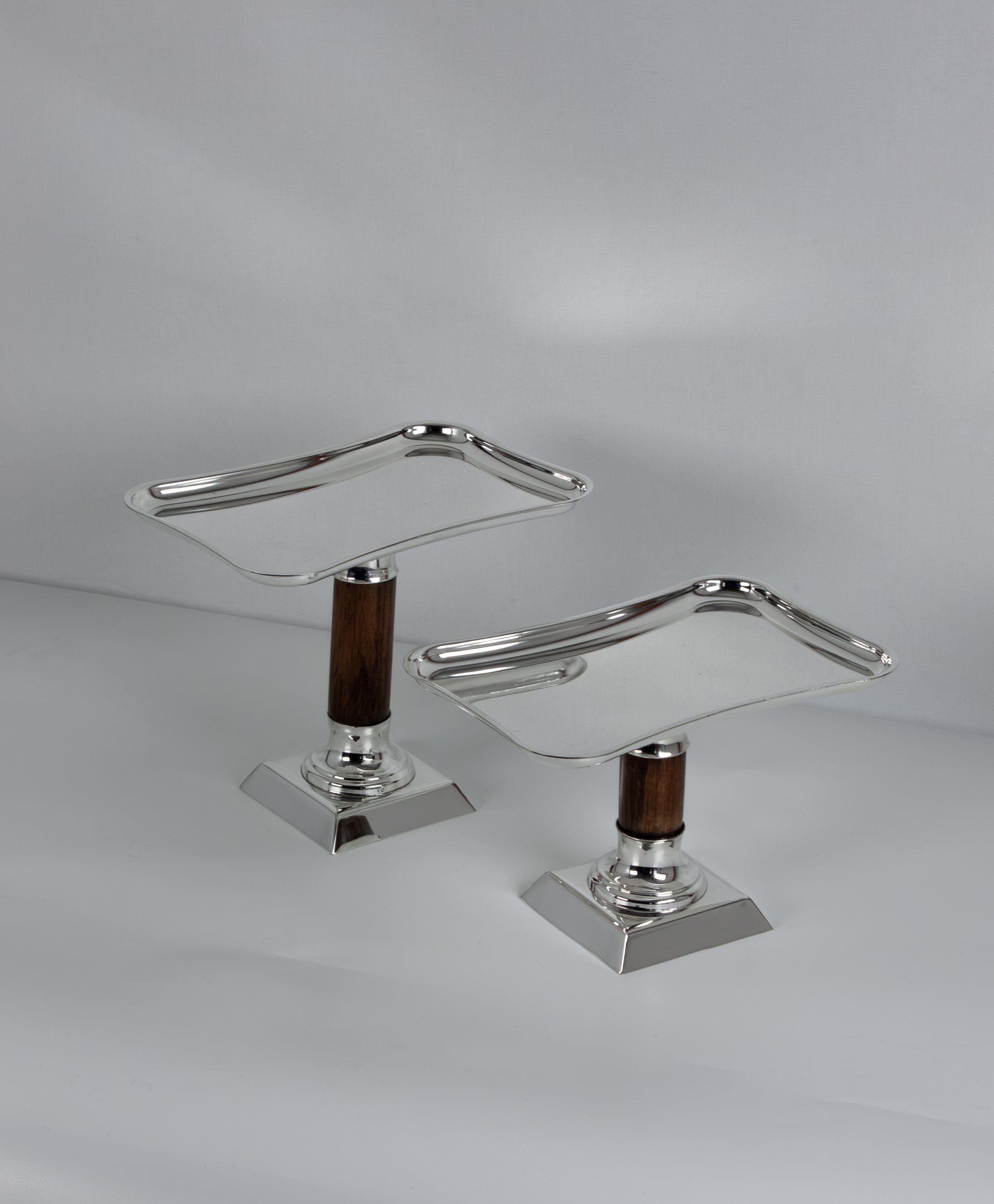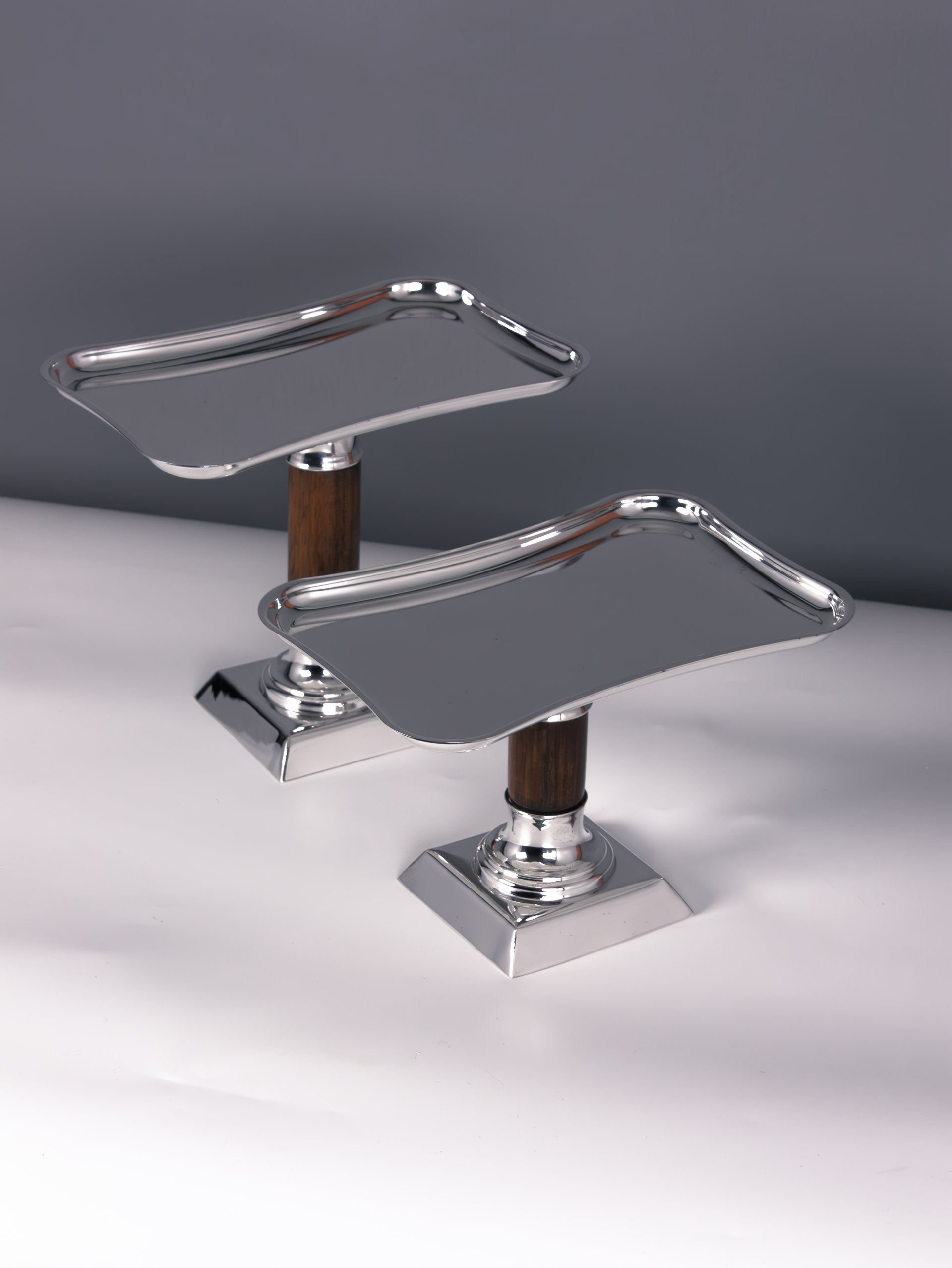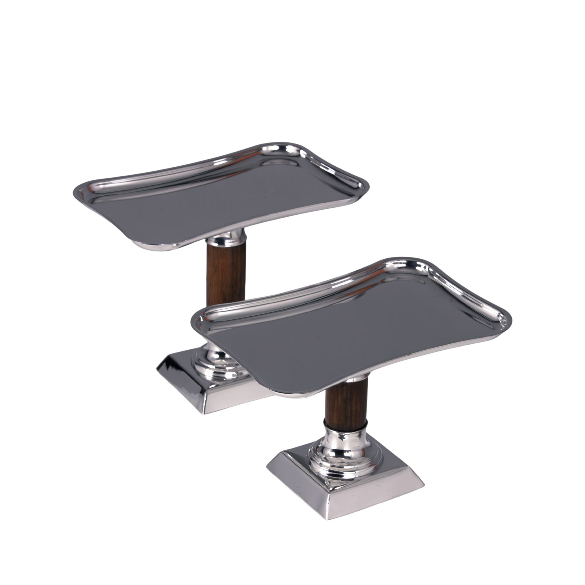 This elegant dessert stand set is handcrafted from solid brass and designed to bring sophistication to dessert presentation. Each stand features a softly curved rectangular tray supported by a polished brass base and a warm wooden stem, creating a beautiful harmony between natural materials and luxurious metal craftsmanship.