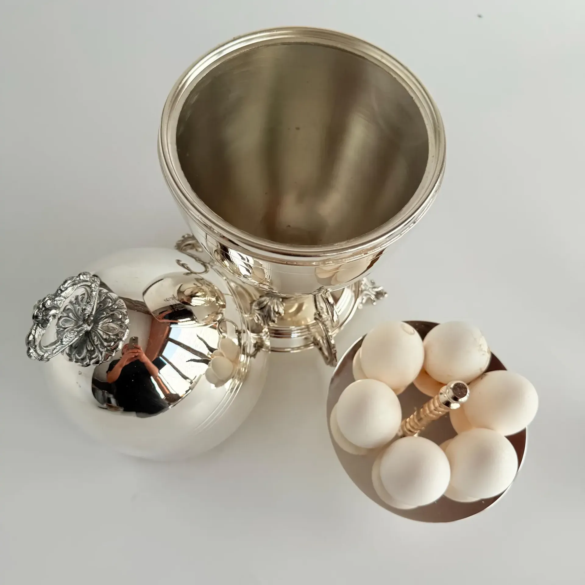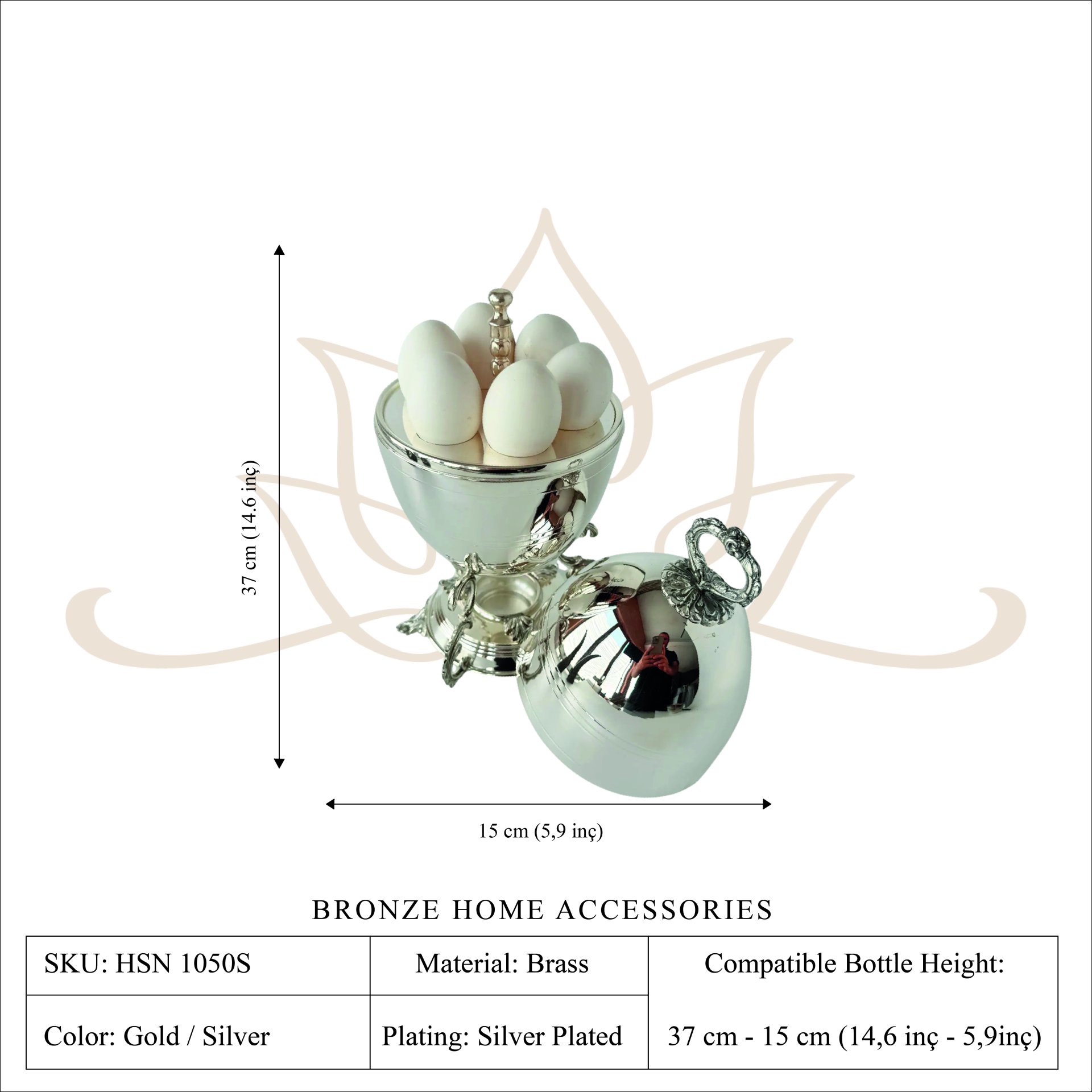 Each piece is individually handmade, giving every egg server subtle variations that highlight authentic artisanal craftsmanship. The polished plated surface reflects light beautifully and enhances the presentation of the eggs inside.