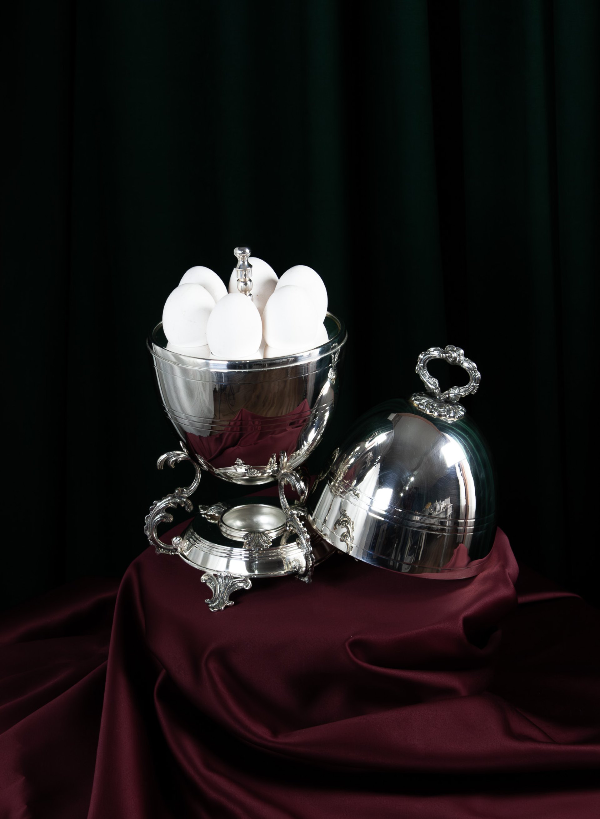 The set features a rounded serving bowl with a removable lid and a stable ornamental base. The lid can be lifted easily using the decorative handle, allowing convenient serving while keeping the eggs warm and protected when closed. Its sculptural egg inspired form makes it a distinctive centerpiece for breakfast and brunch tables.