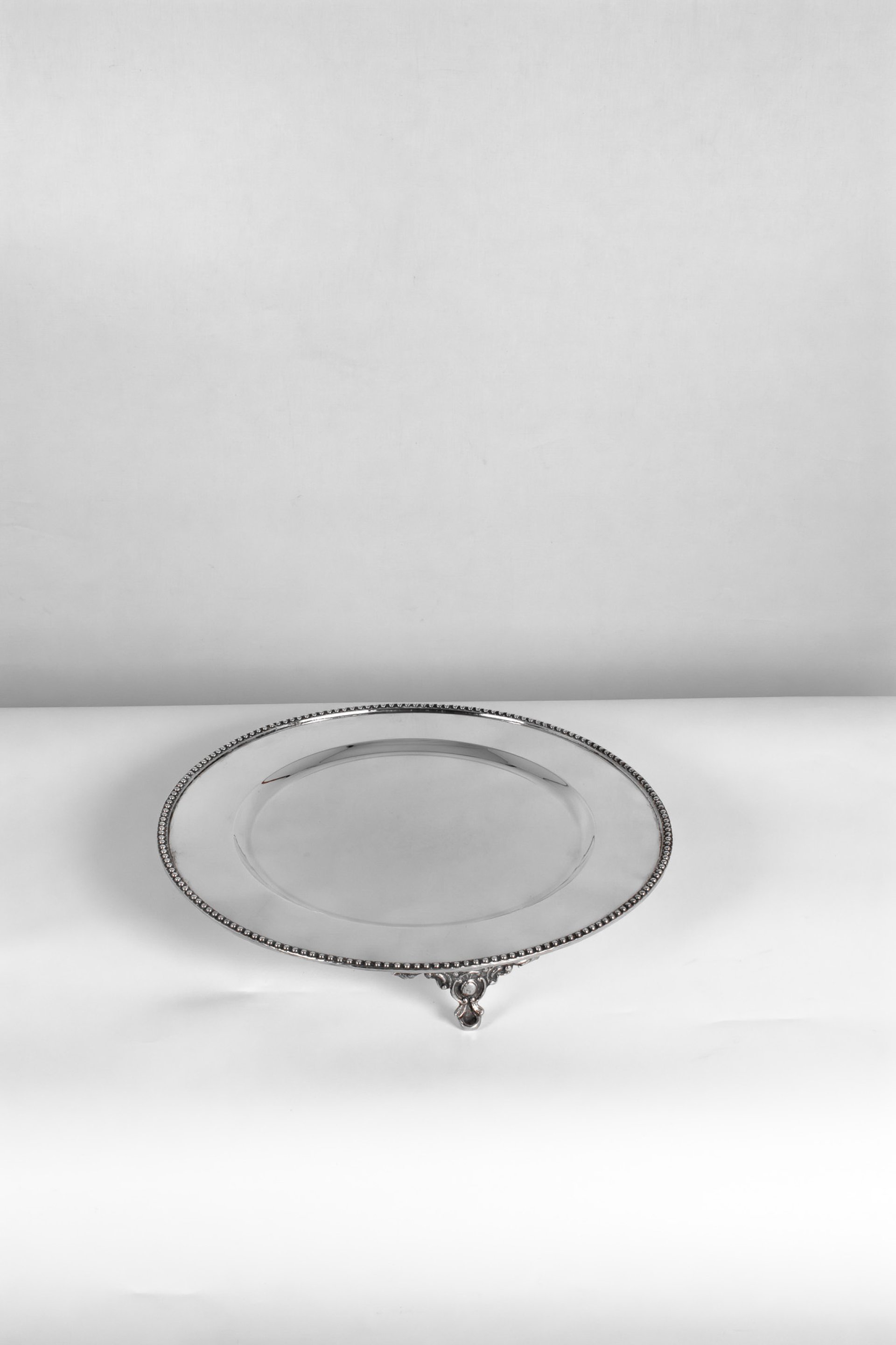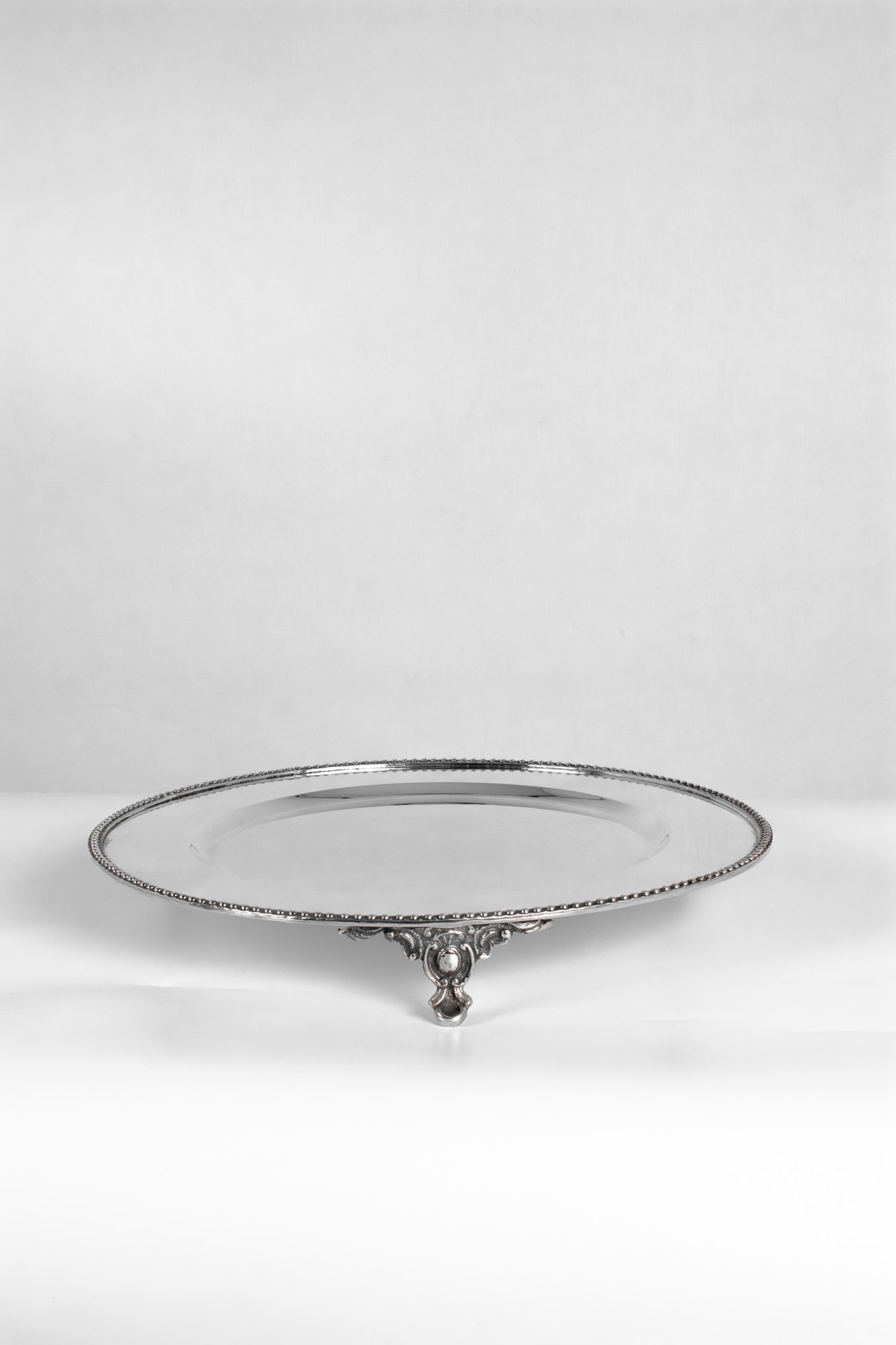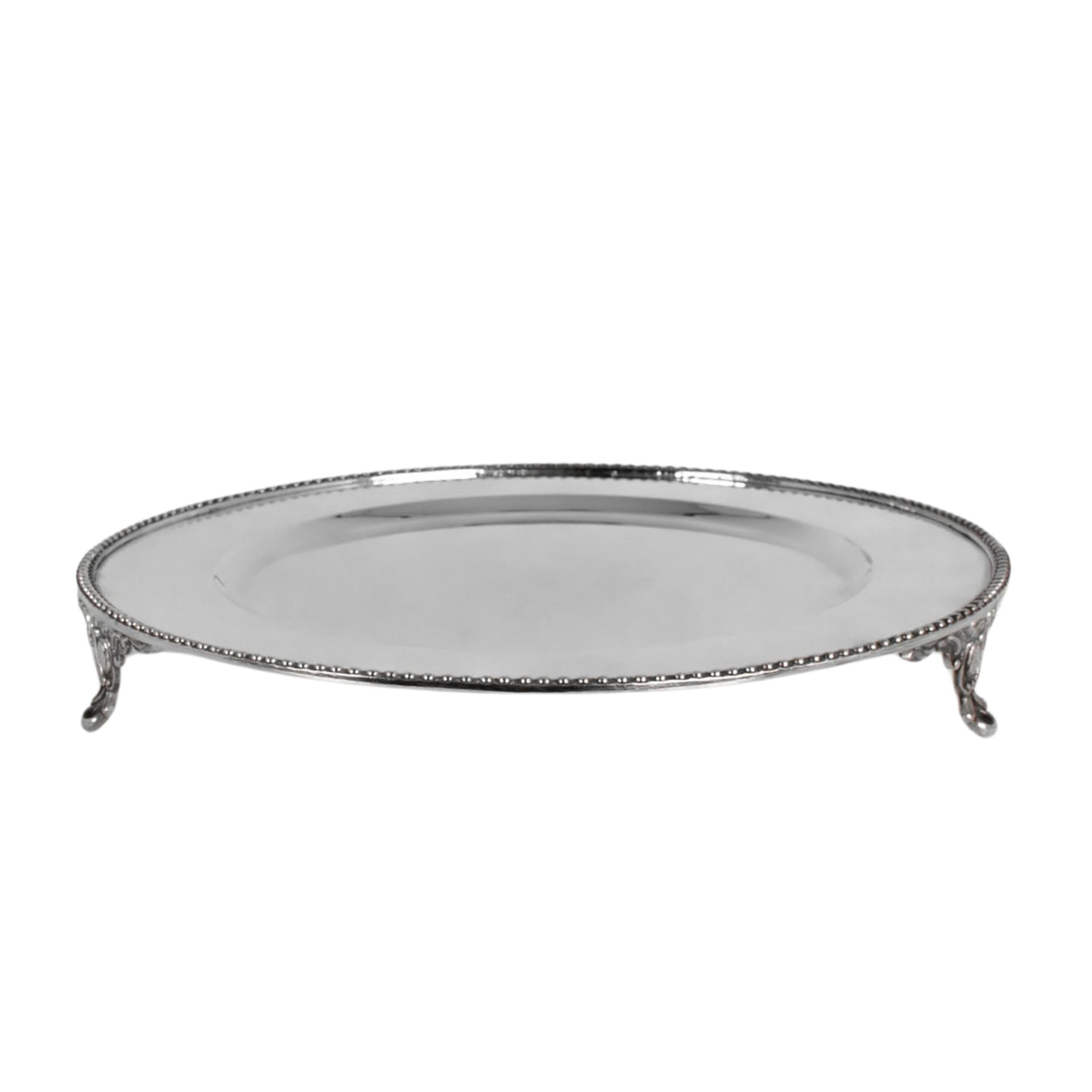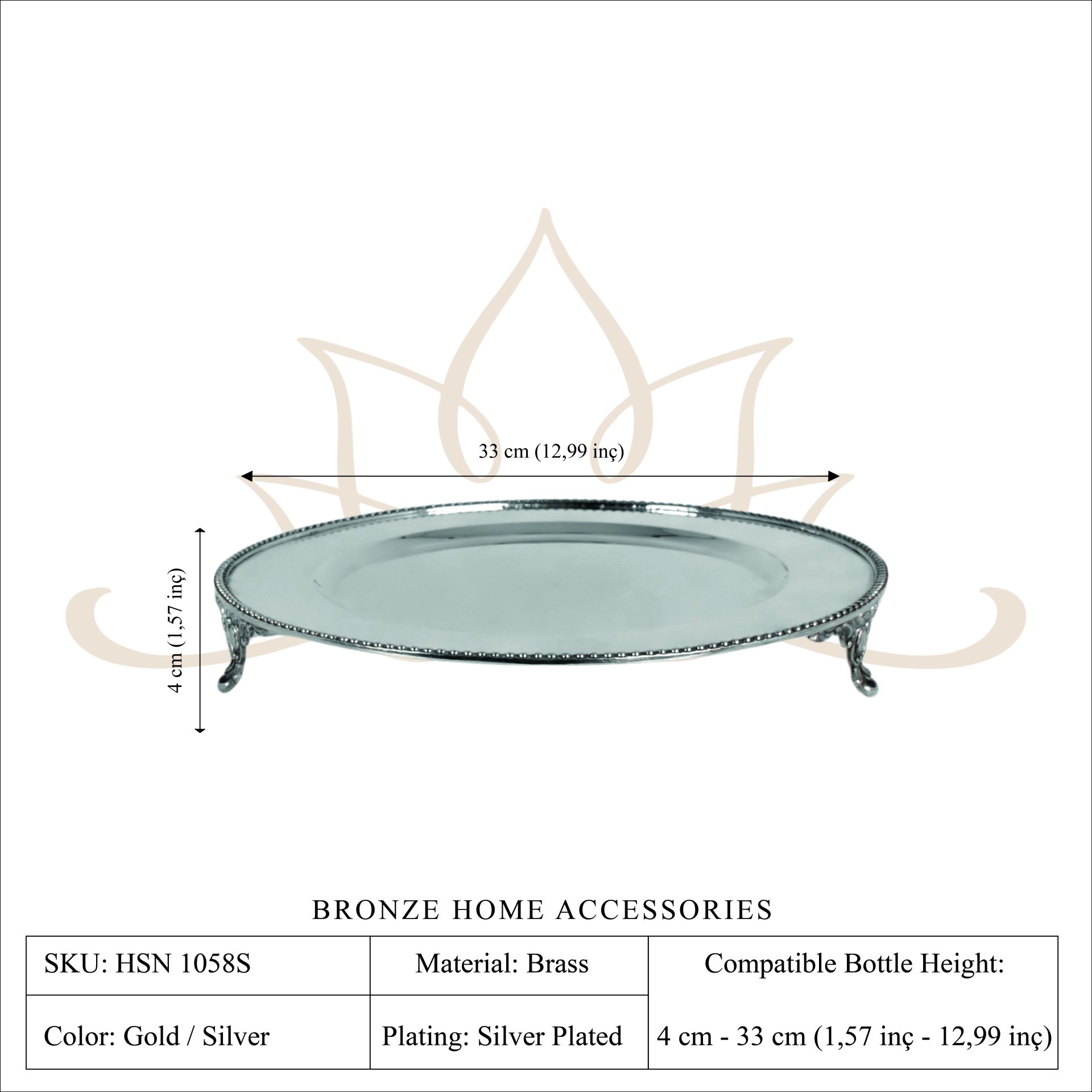 This elegant footed serving tray is handcrafted from solid brass by skilled artisans, reflecting traditional craftsmanship and timeless tableware design. The tray features a classic round form with a delicately detailed rim and graceful curved feet that elevate the surface slightly above the table.