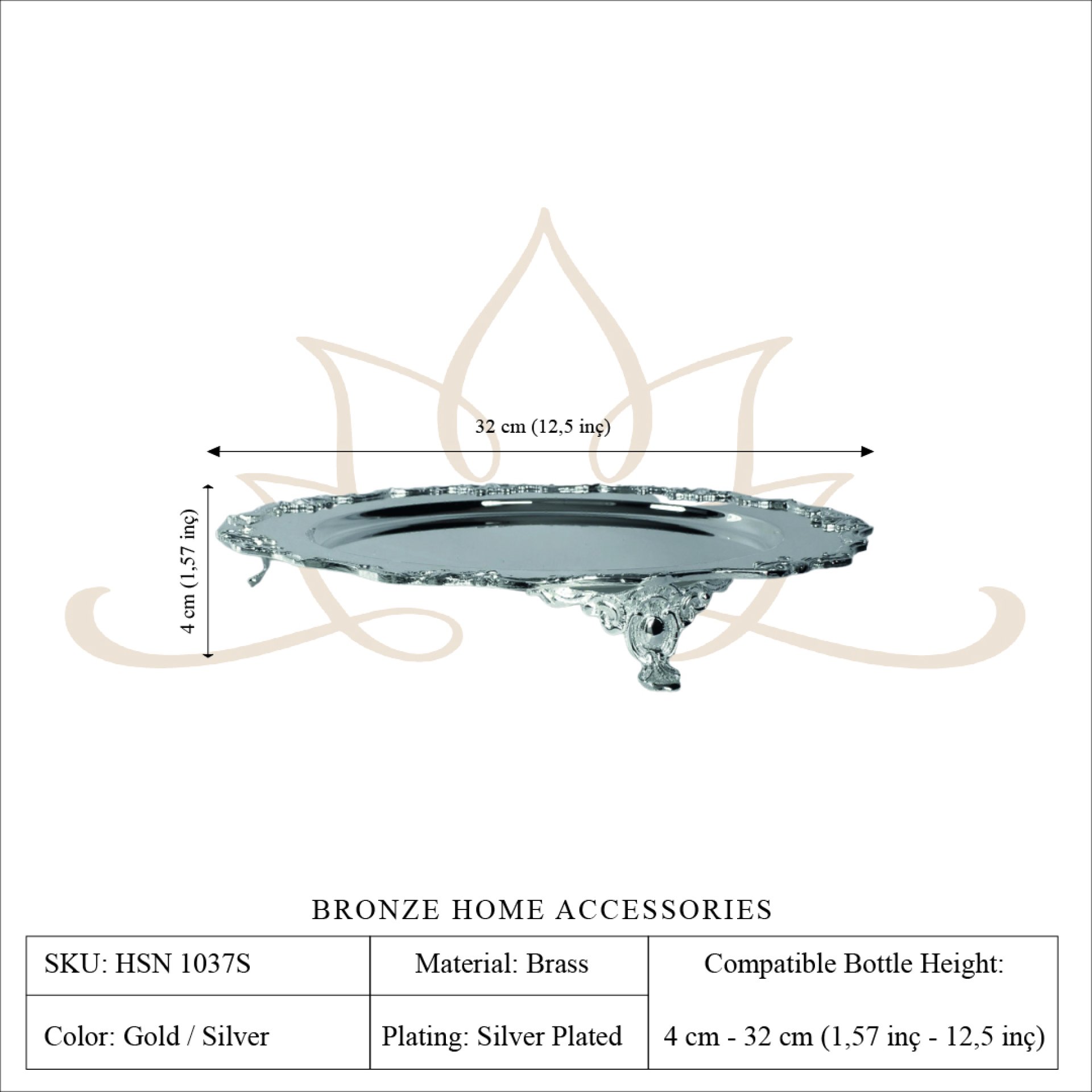 This elegant footed serving tray is handcrafted from solid brass using traditional metalworking techniques. The decorative edge and sculptural feet create a balanced and sophisticated silhouette that enhances any table setting. Designed for the Bronze Home Accessories collection, the piece reflects careful craftsmanship and timeless decorative design.
