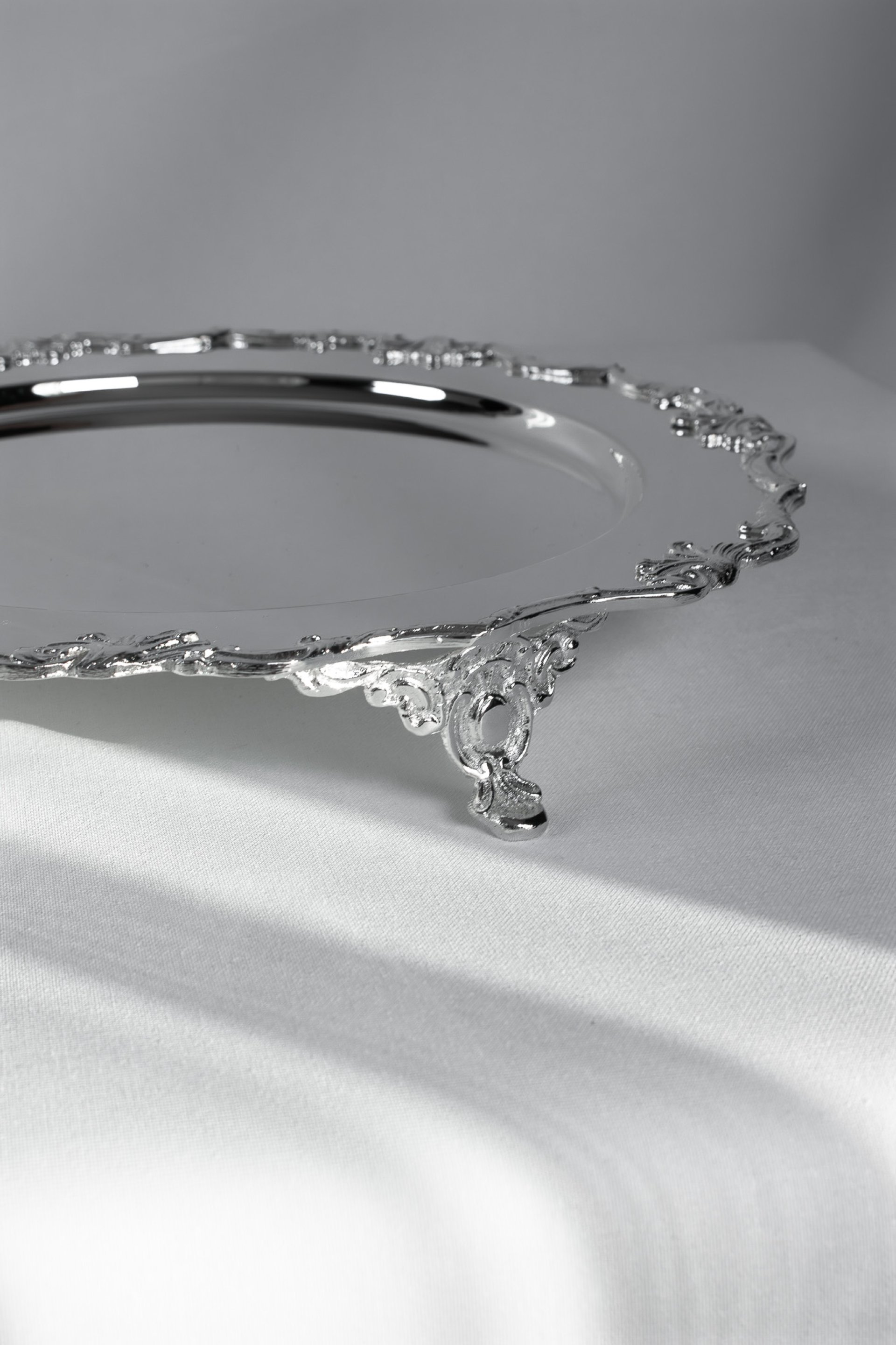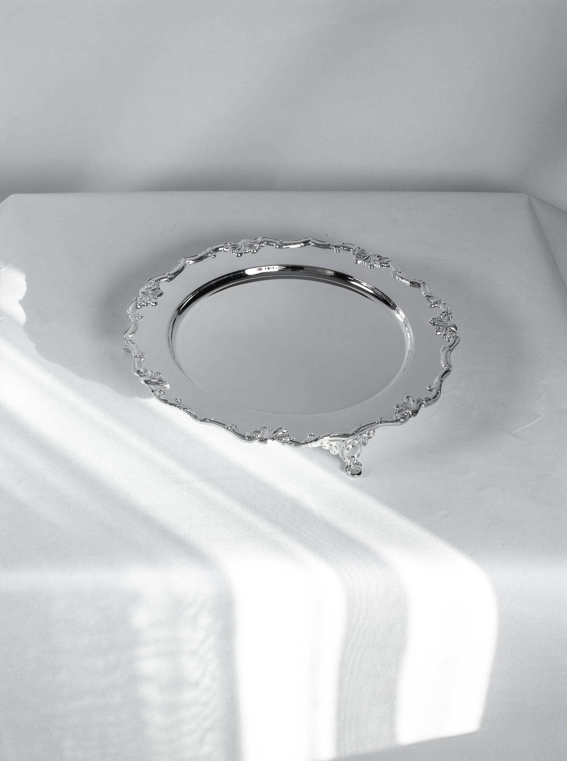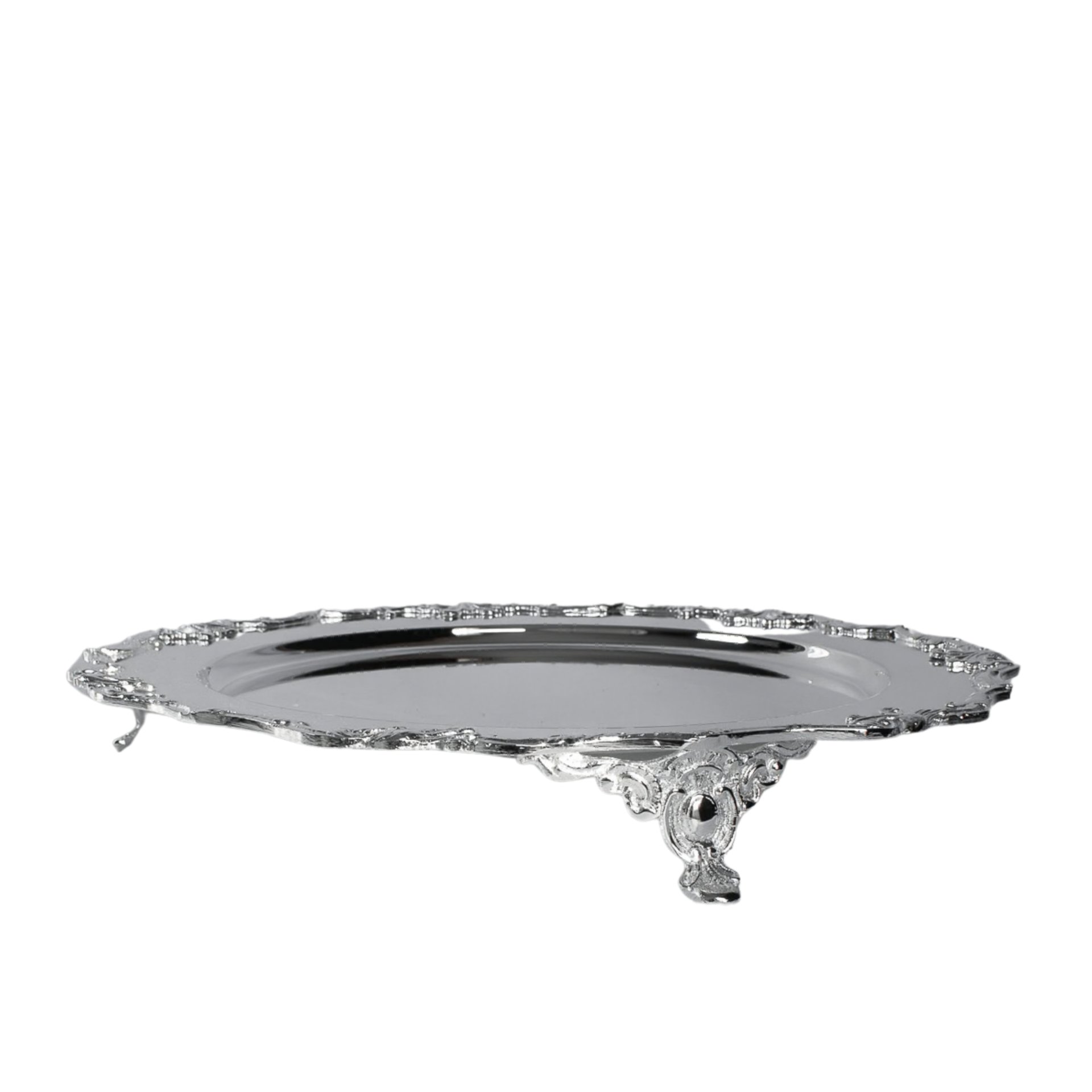 The low pedestal structure subtly elevates the tray from the table surface, allowing cakes, desserts, or decorative items to be displayed with elegance. Its ornamental rim and classic base details give the tray a refined character that complements both traditional and modern interiors.