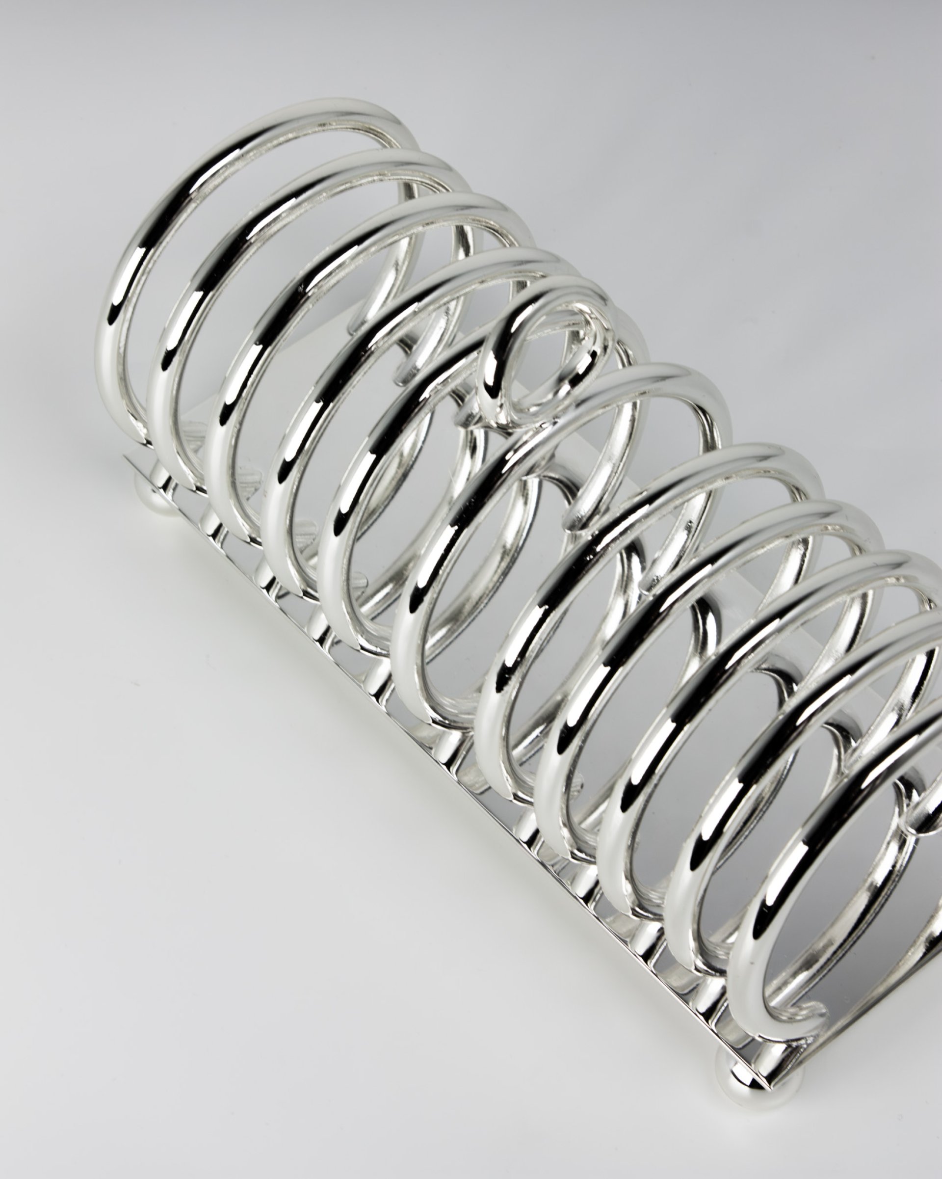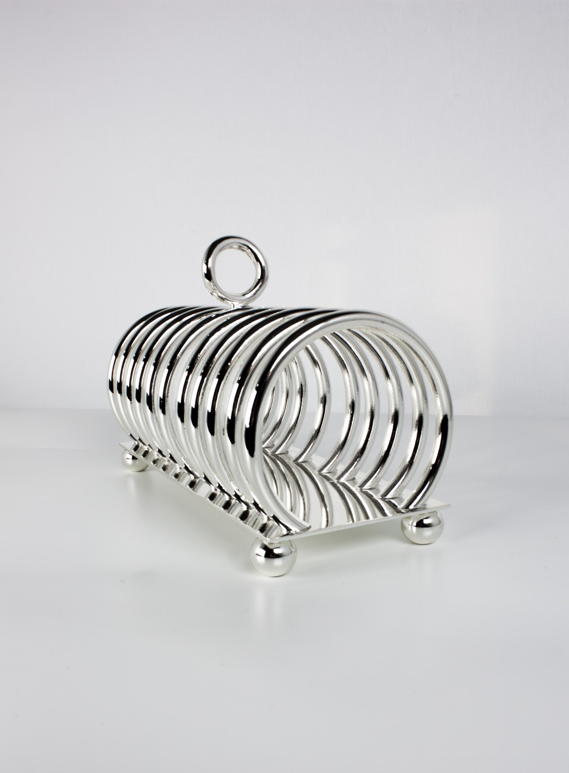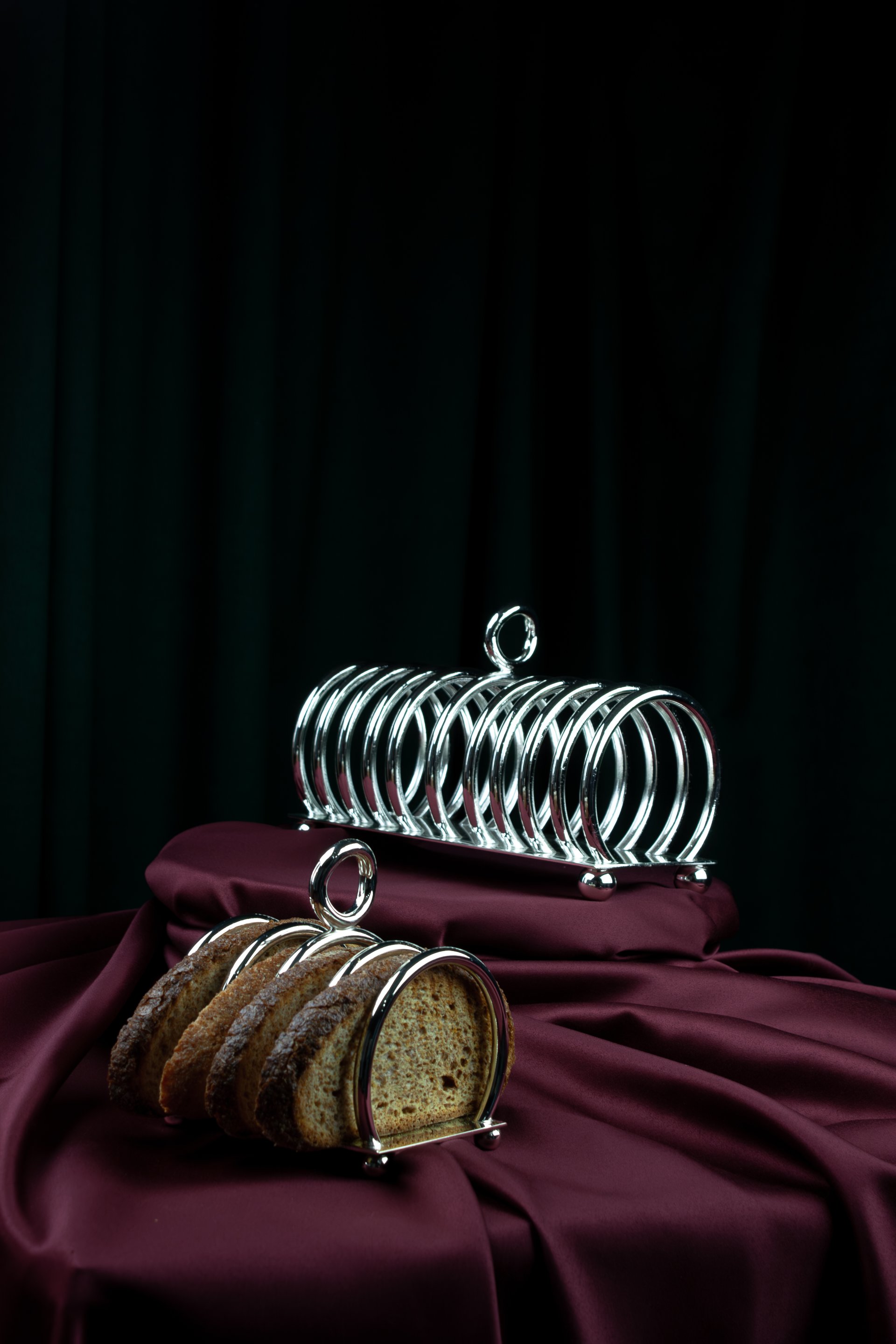 The curved ring design allows proper air circulation around bread and baked goods, helping them stay fresh while also presenting them beautifully on the table. The polished metallic surface reflects light softly and enhances the visual presentation of breads, pastries and breakfast items.