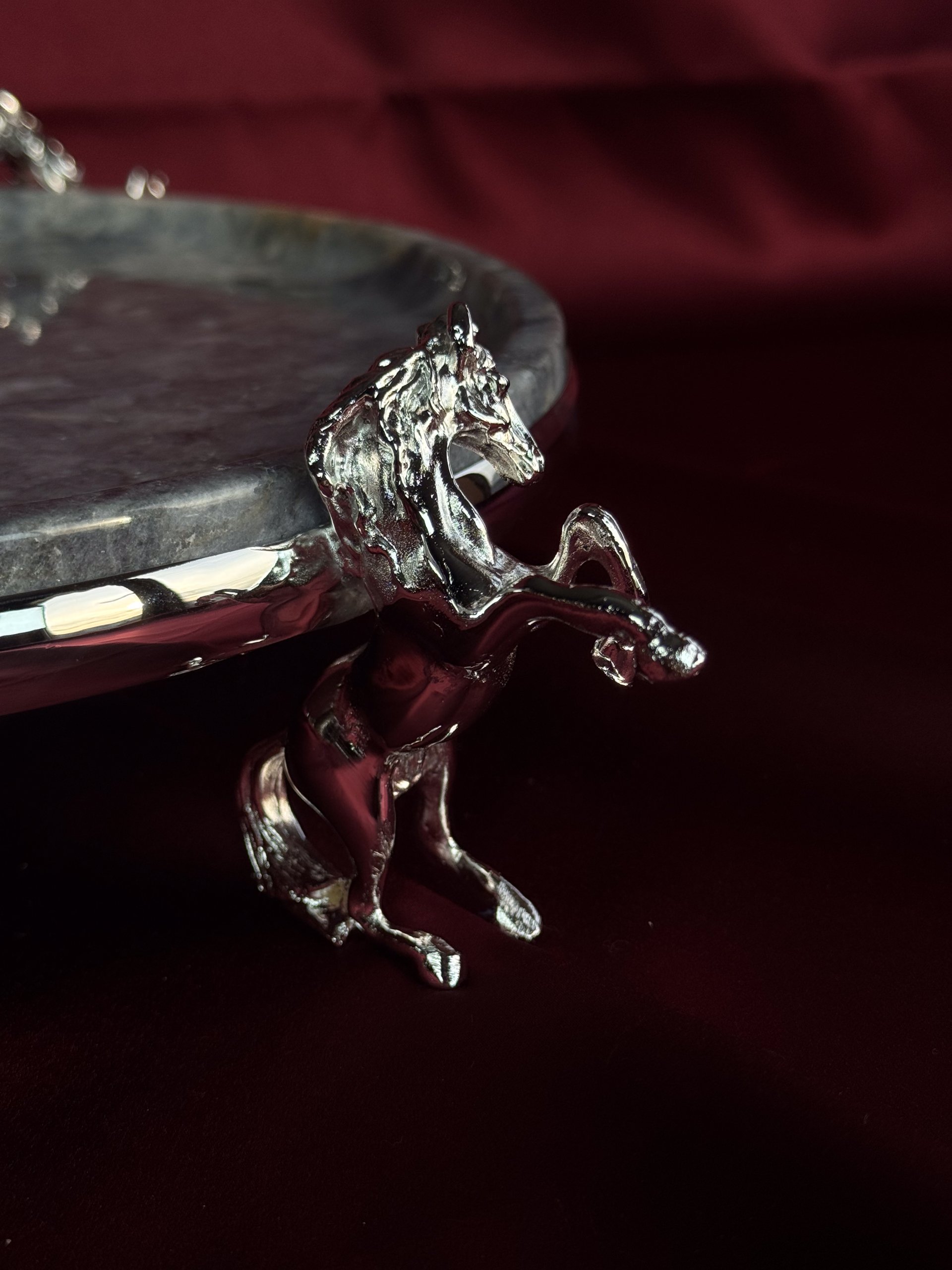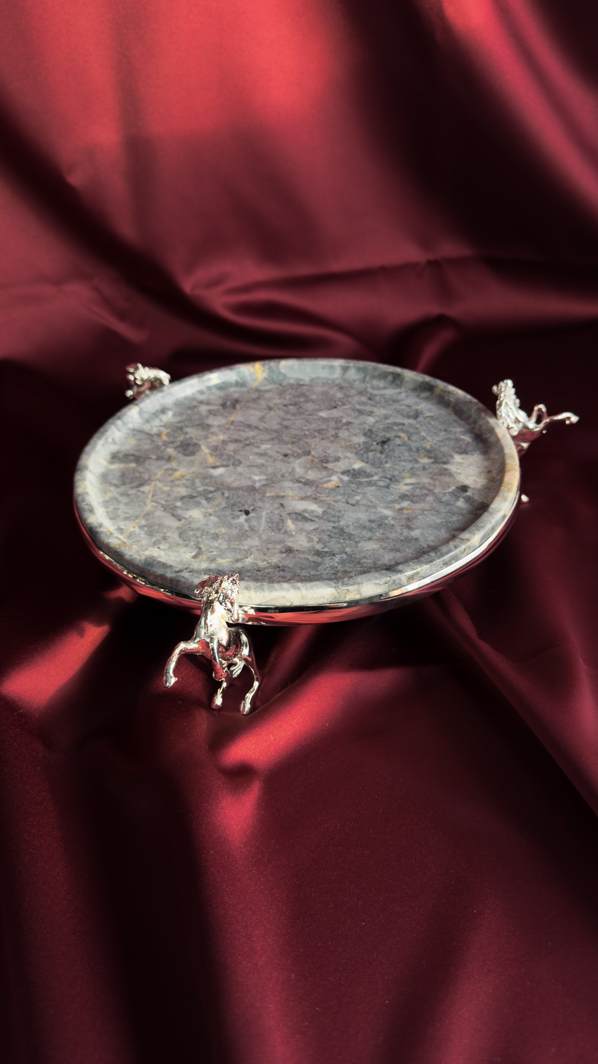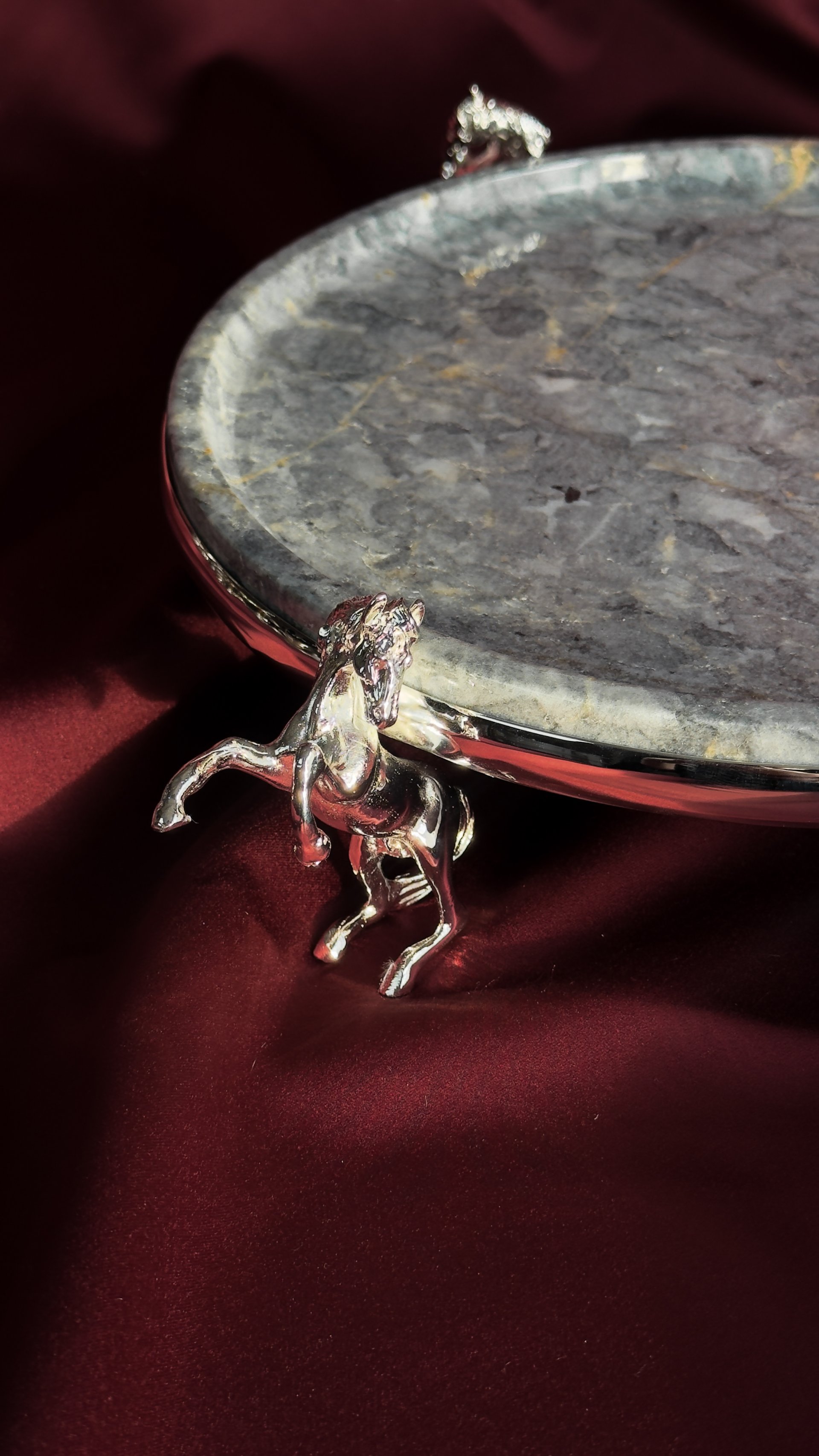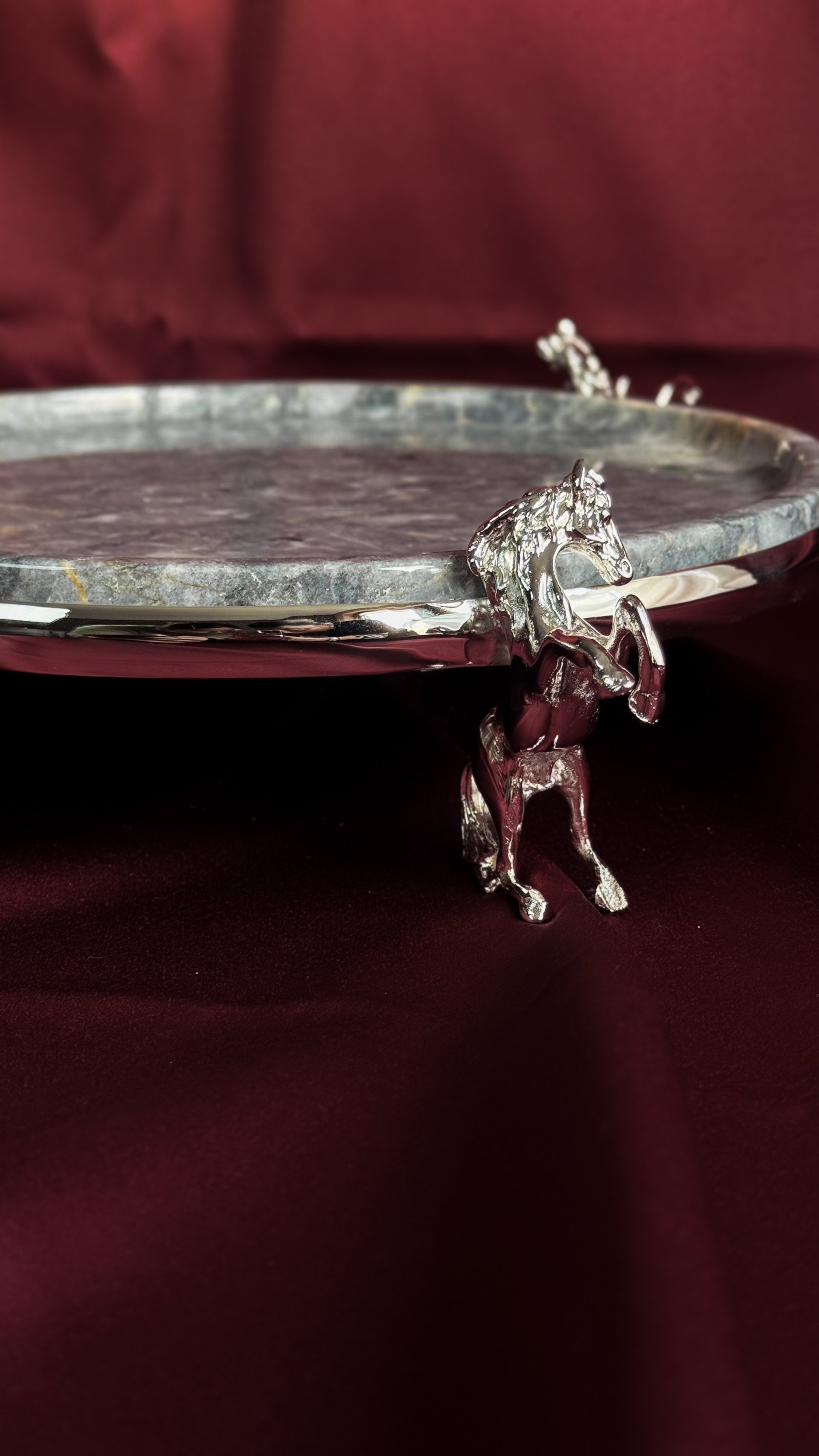 This handmade brass round marble cake stand is designed as a striking statement piece for refined interiors and sophisticated table settings. The natural marble top creates a luxurious serving surface, while three sculptural horse figurines elevate the stand and give the design a distinctive artistic character. The combination of natural stone and decorative metalwork creates a powerful balance between elegance, strength, and craftsmanship.