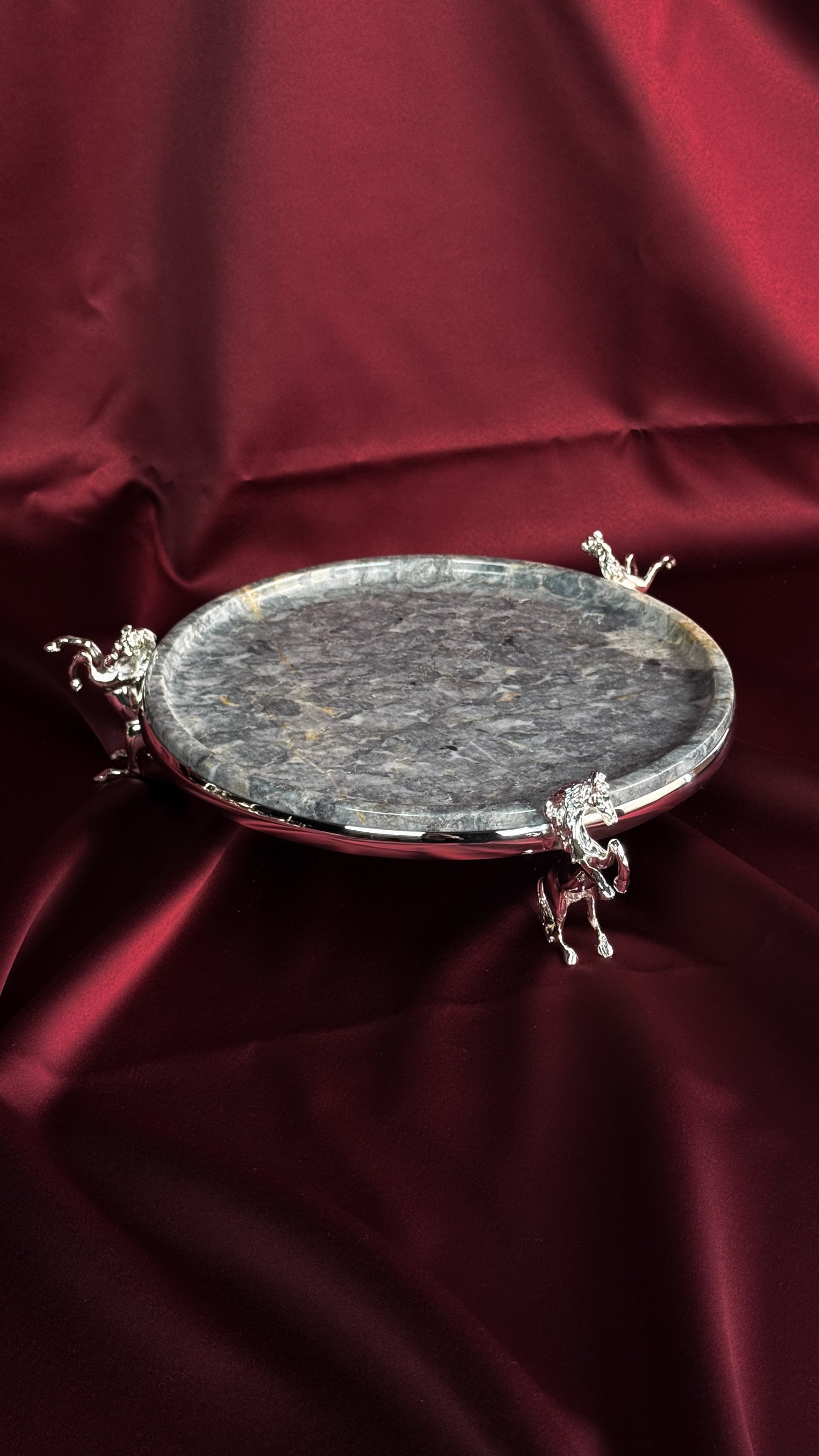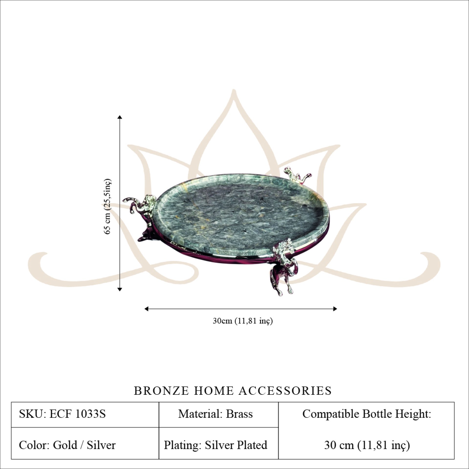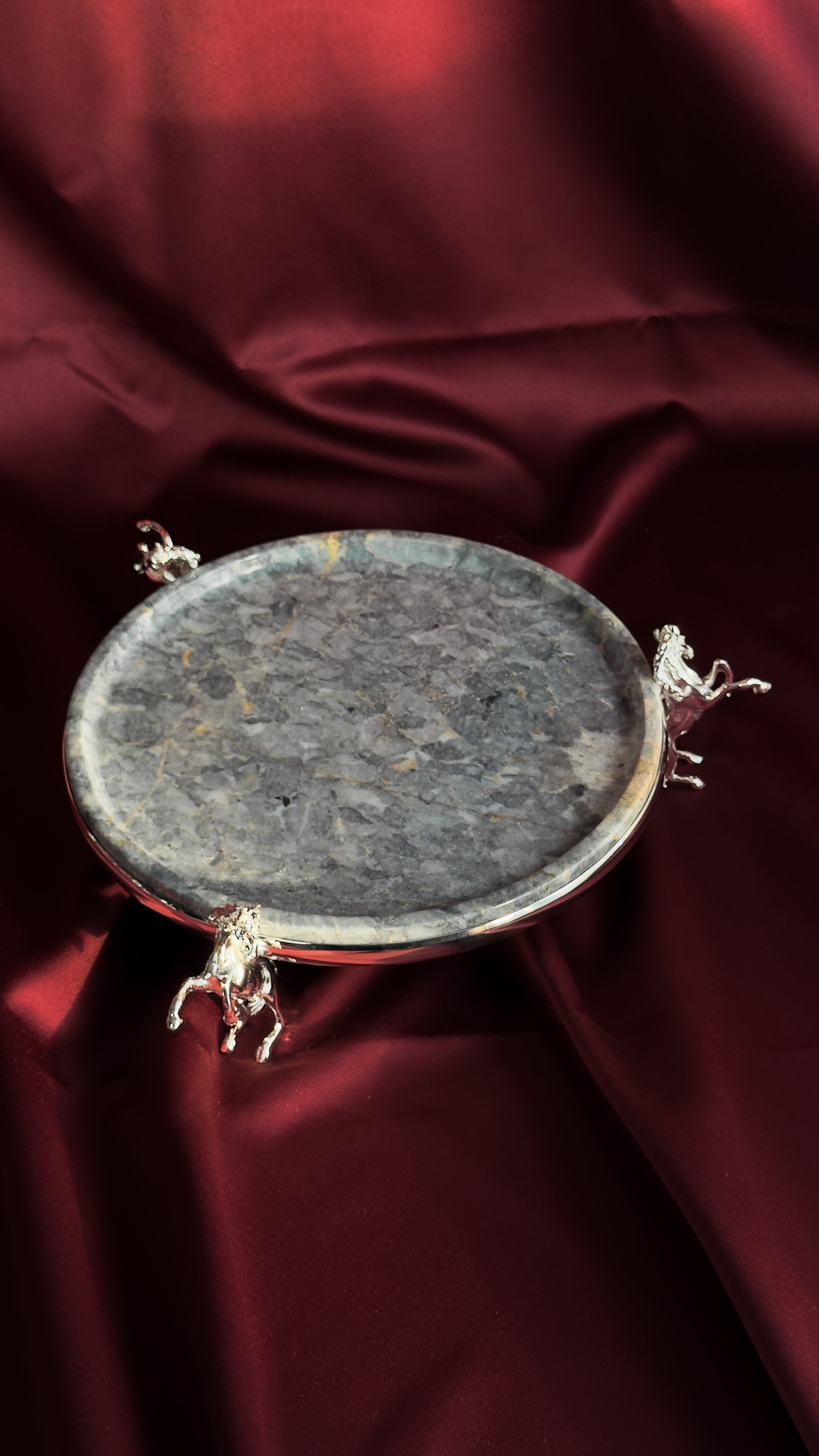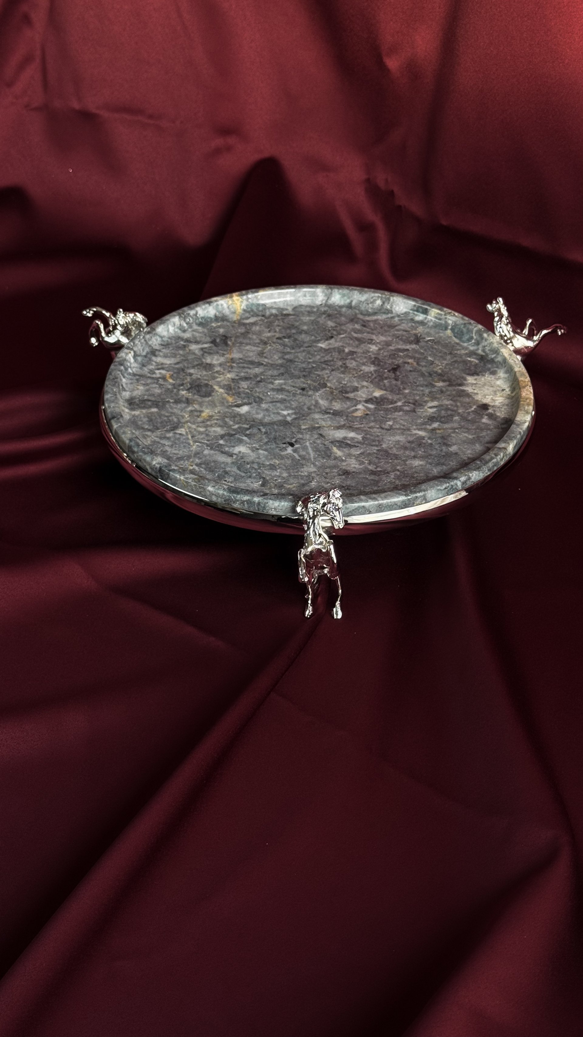 This handmade brass round marble cake stand is designed as a striking statement piece for refined interiors and sophisticated table settings. The natural marble top creates a luxurious serving surface, while three sculptural horse figurines elevate the stand and give the design a distinctive artistic character. The combination of natural stone and decorative metalwork creates a powerful balance between elegance, strength, and craftsmanship.
