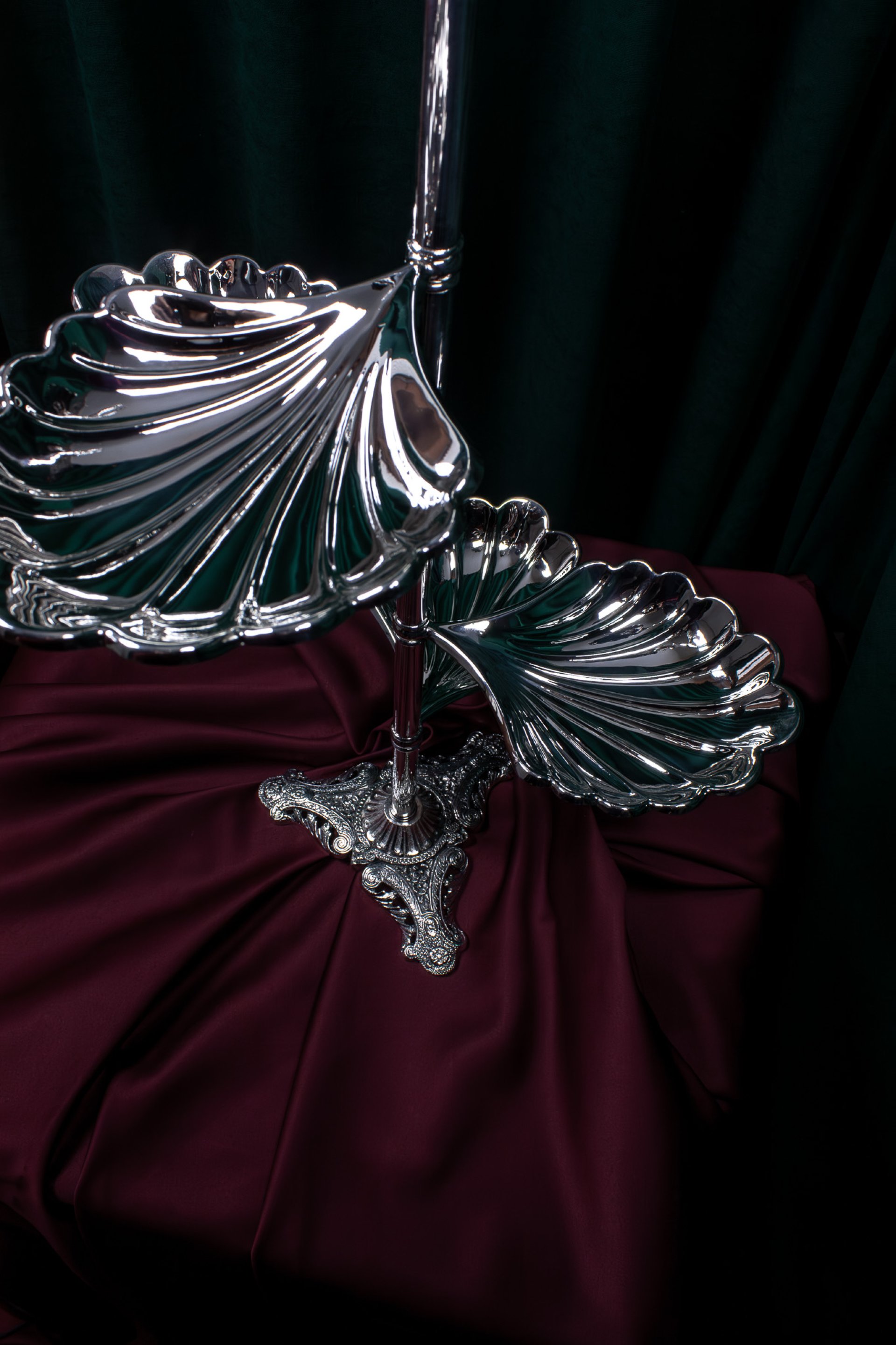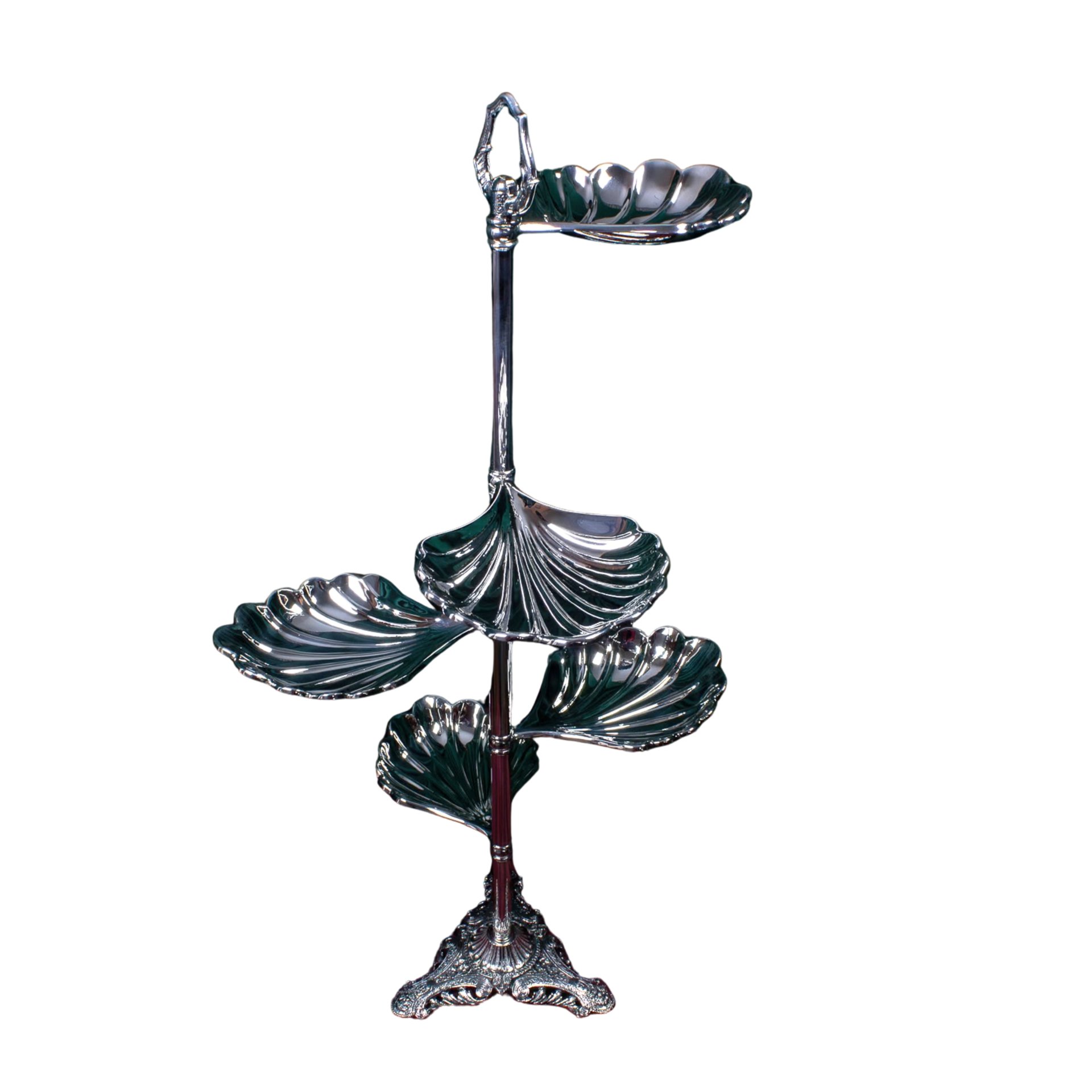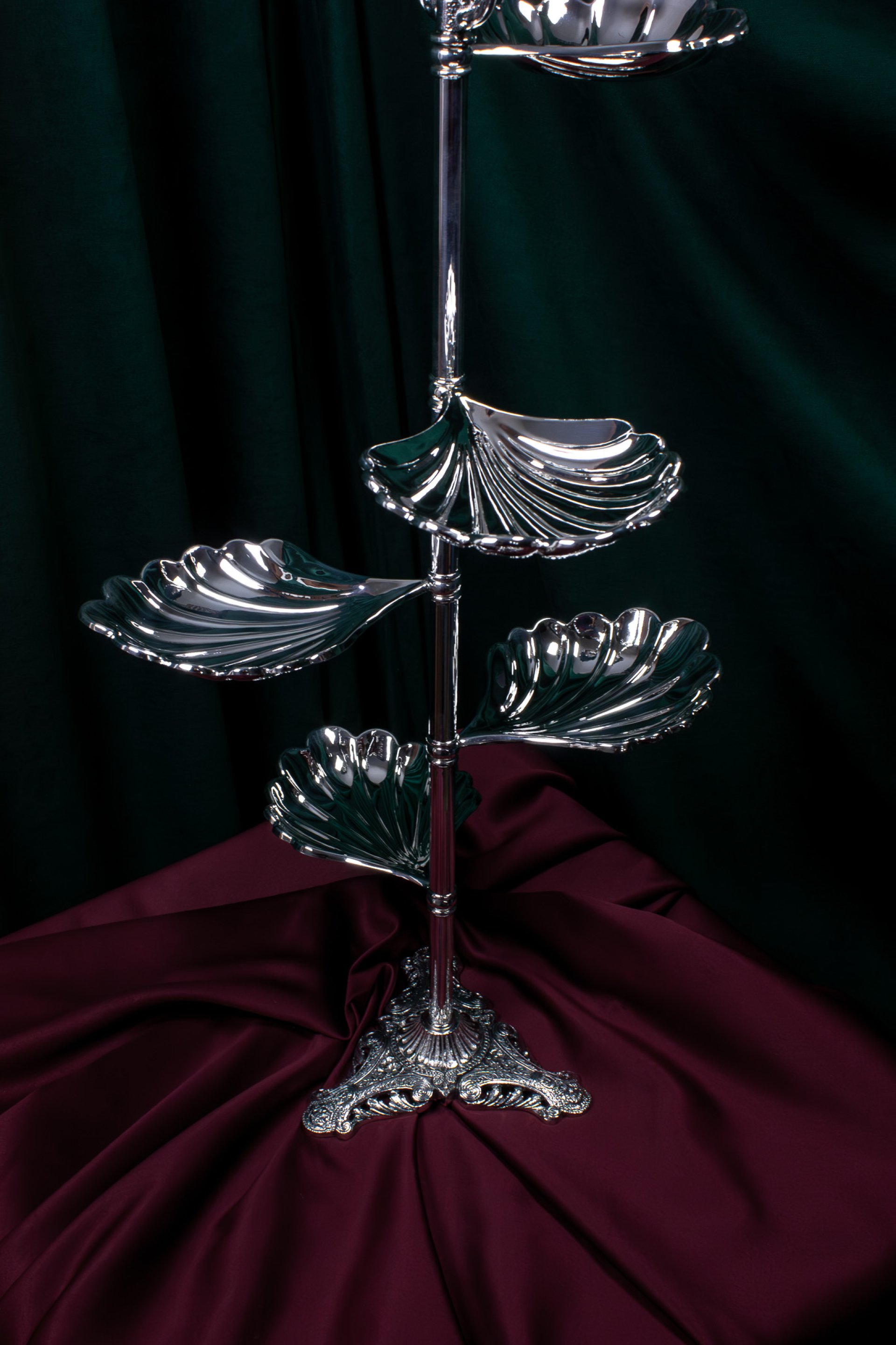 This elegant multi tier serving stand is handcrafted from solid brass by skilled artisans and designed to create a striking presentation for desserts and gourmet servings. Inspired by natural shell forms, each plate features a sculptural shape that adds artistic elegance and visual movement to the stand.