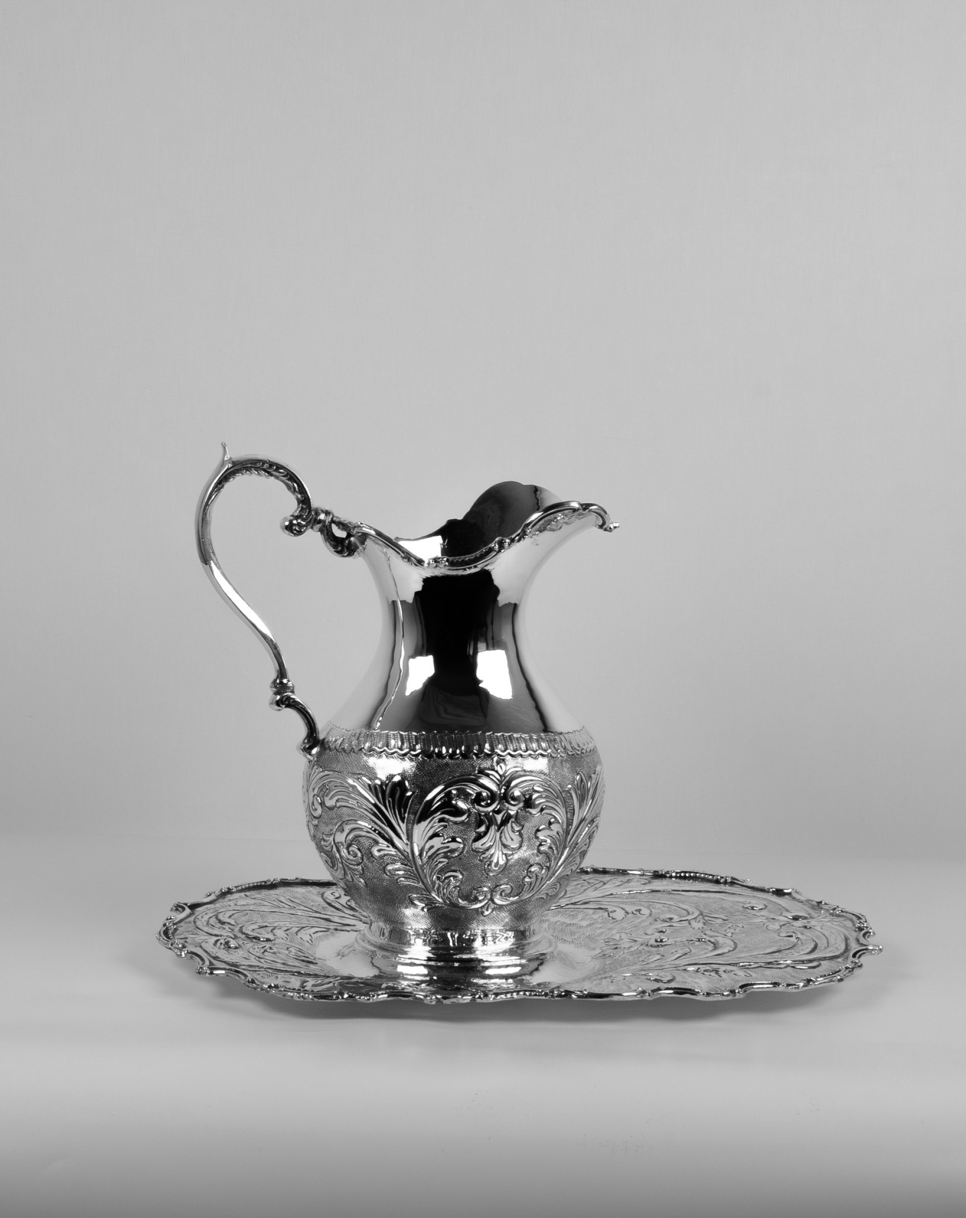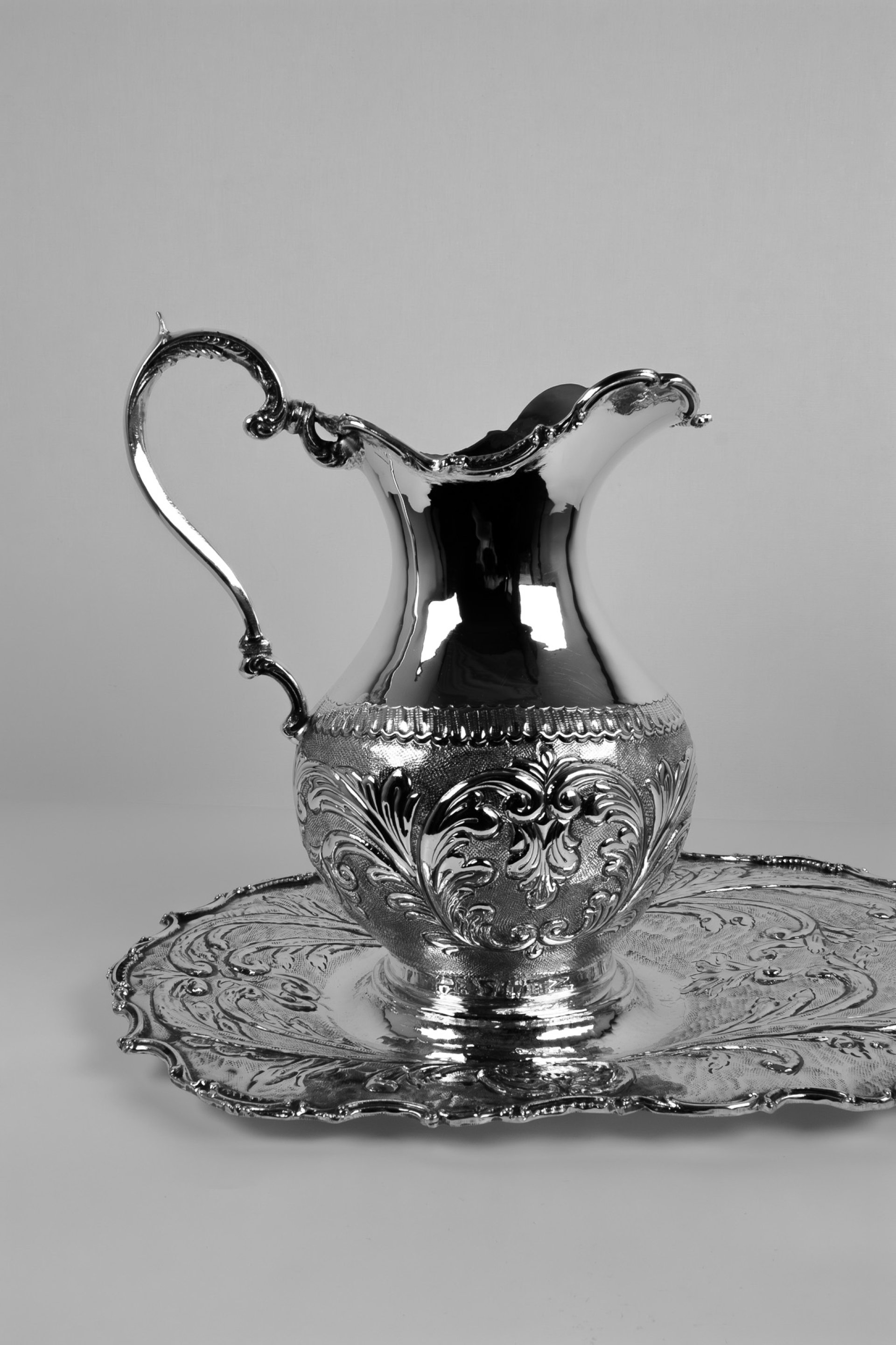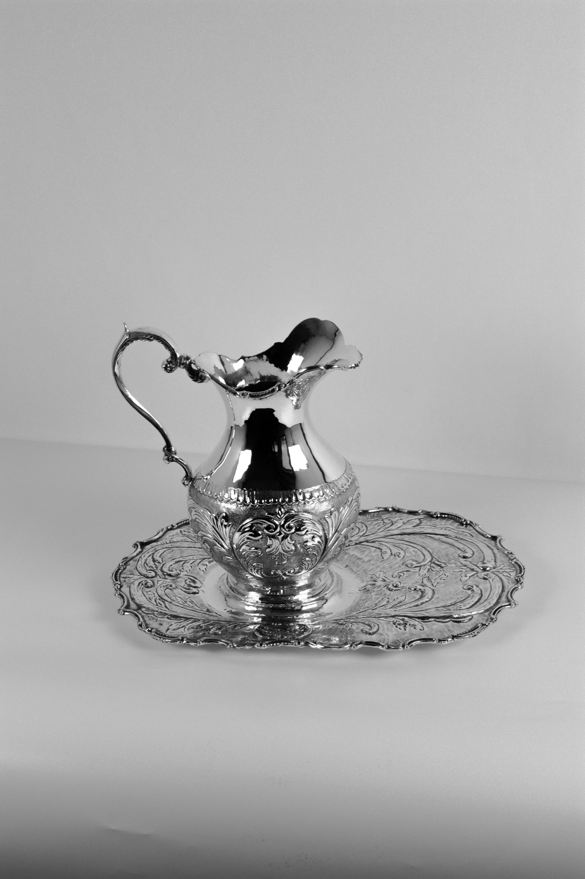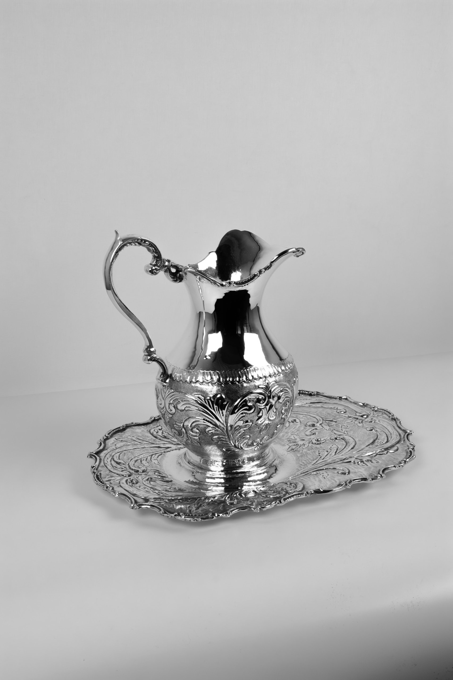 This elegant serving set features a handcrafted brass pitcher paired with an ornate serving tray, combining traditional craftsmanship with timeless decorative design. Carefully produced by skilled artisans, the pitcher features intricate embossed detailing around the body, a gracefully curved handle and a sculpted pouring spout that enhances both functionality and aesthetic appeal.