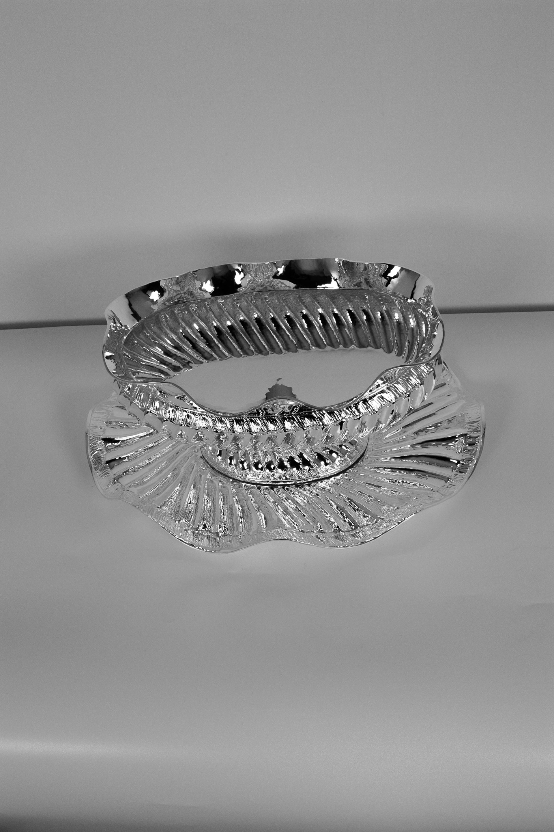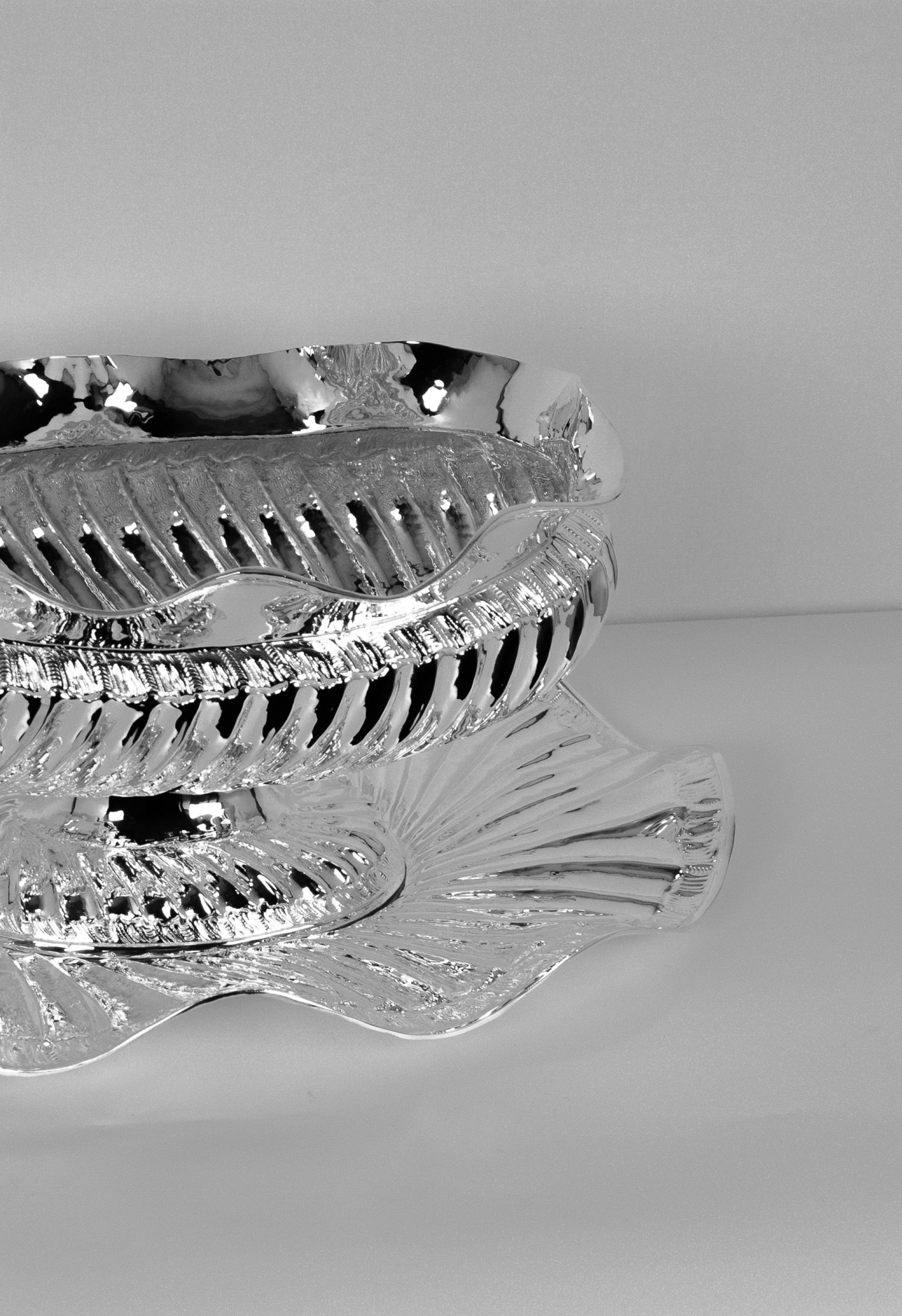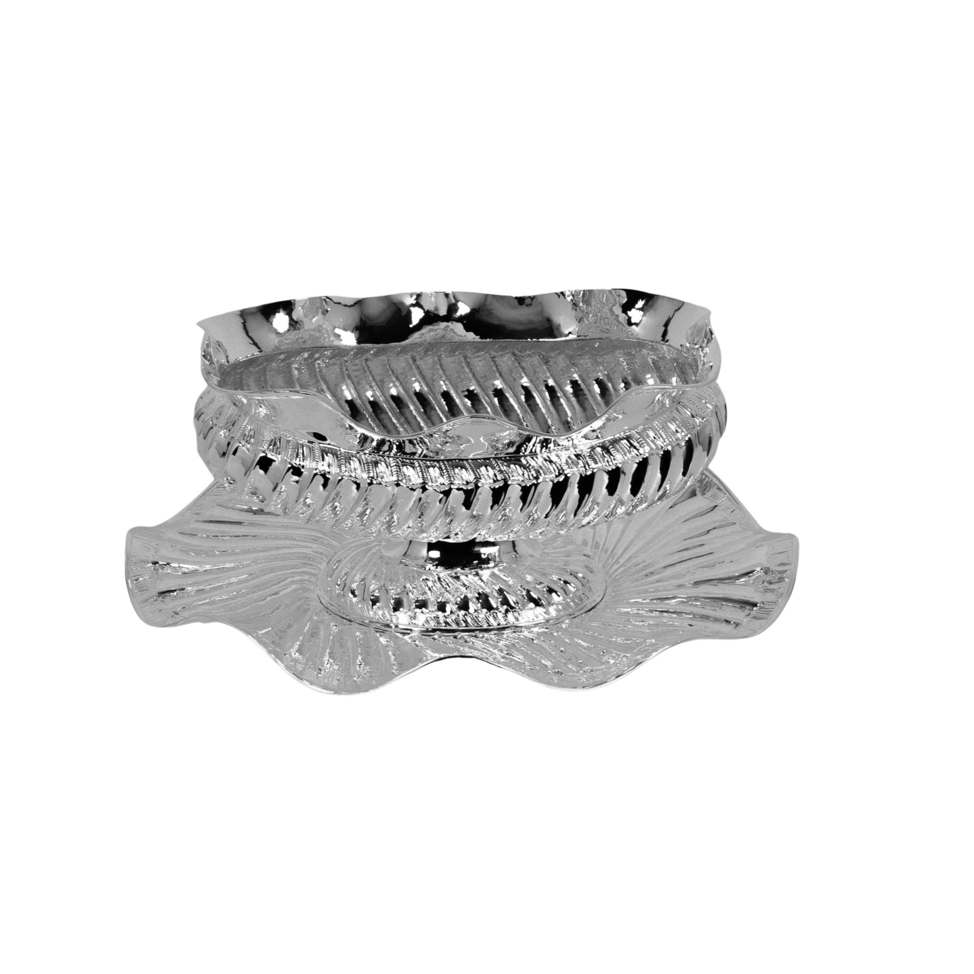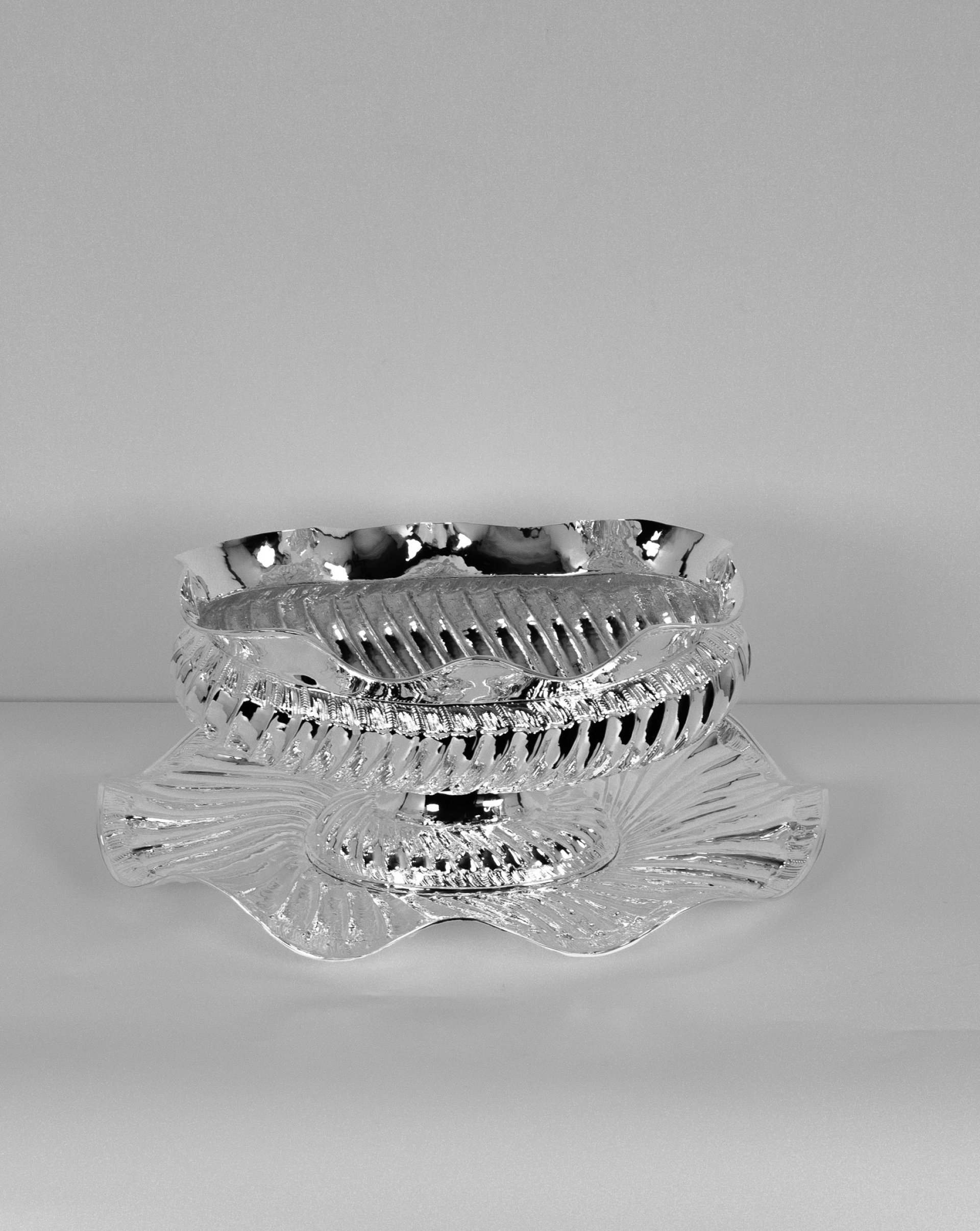 This elegant sugar bowl is handcrafted from solid brass and finished with a bright silver plating that highlights its sculptural shape and detailed textures. The bowl features flowing edges and a ribbed decorative pattern that reflects light beautifully, giving the piece a refined and luxurious appearance. Each item is individually handmade, making every bowl slightly unique and emphasizing the craftsmanship behind its design.