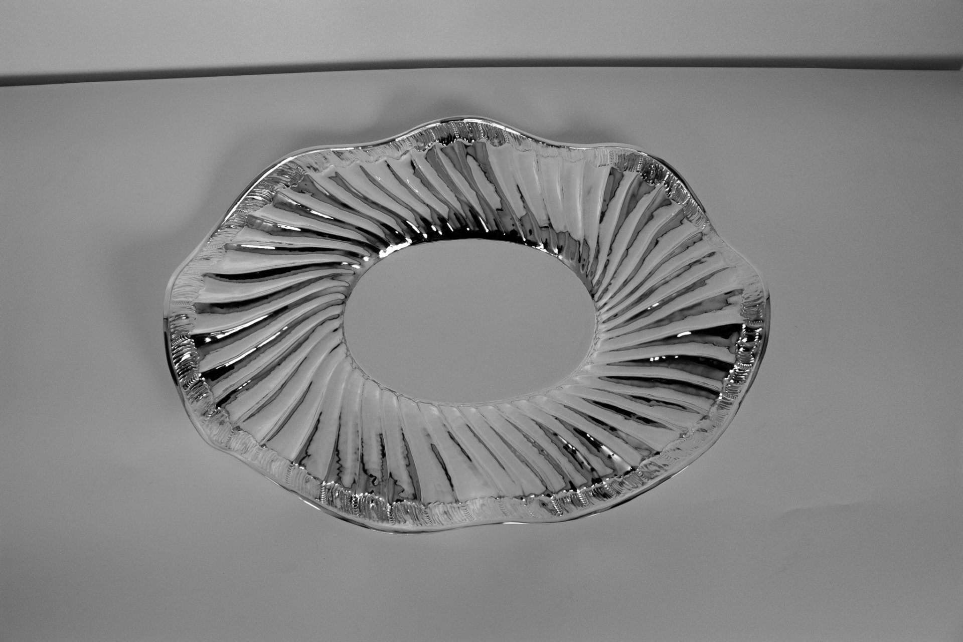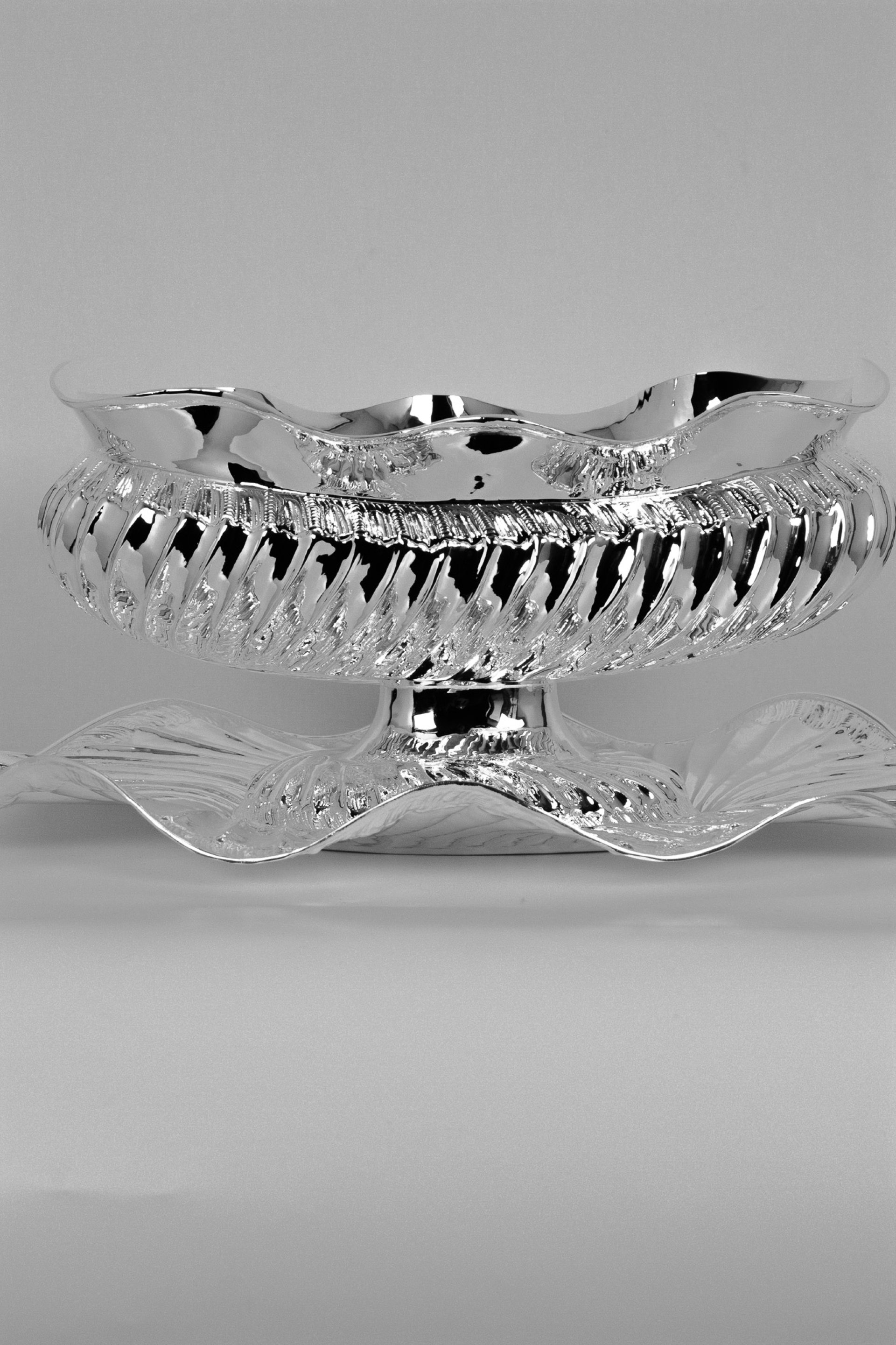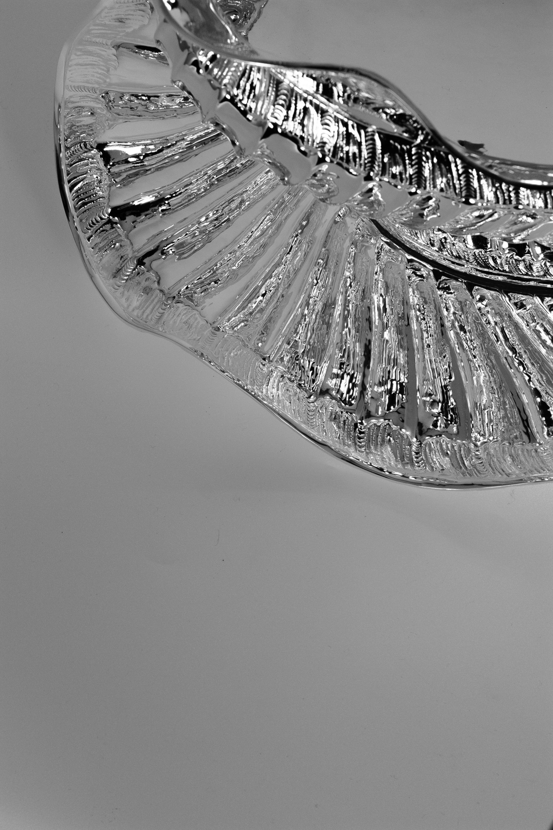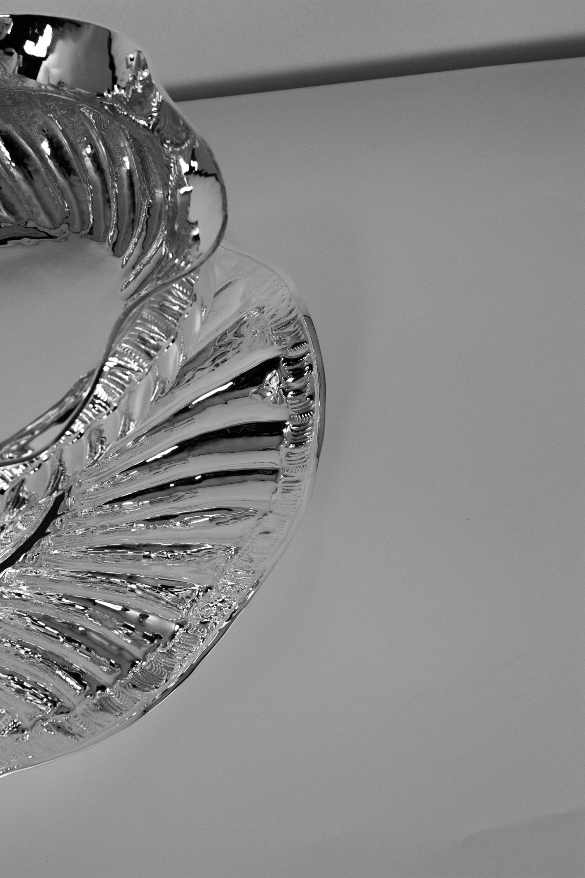 This elegant sugar bowl is handcrafted from solid brass and finished with a bright silver plating that highlights its sculptural shape and detailed textures. The bowl features flowing edges and a ribbed decorative pattern that reflects light beautifully, giving the piece a refined and luxurious appearance. Each item is individually handmade, making every bowl slightly unique and emphasizing the craftsmanship behind its design.