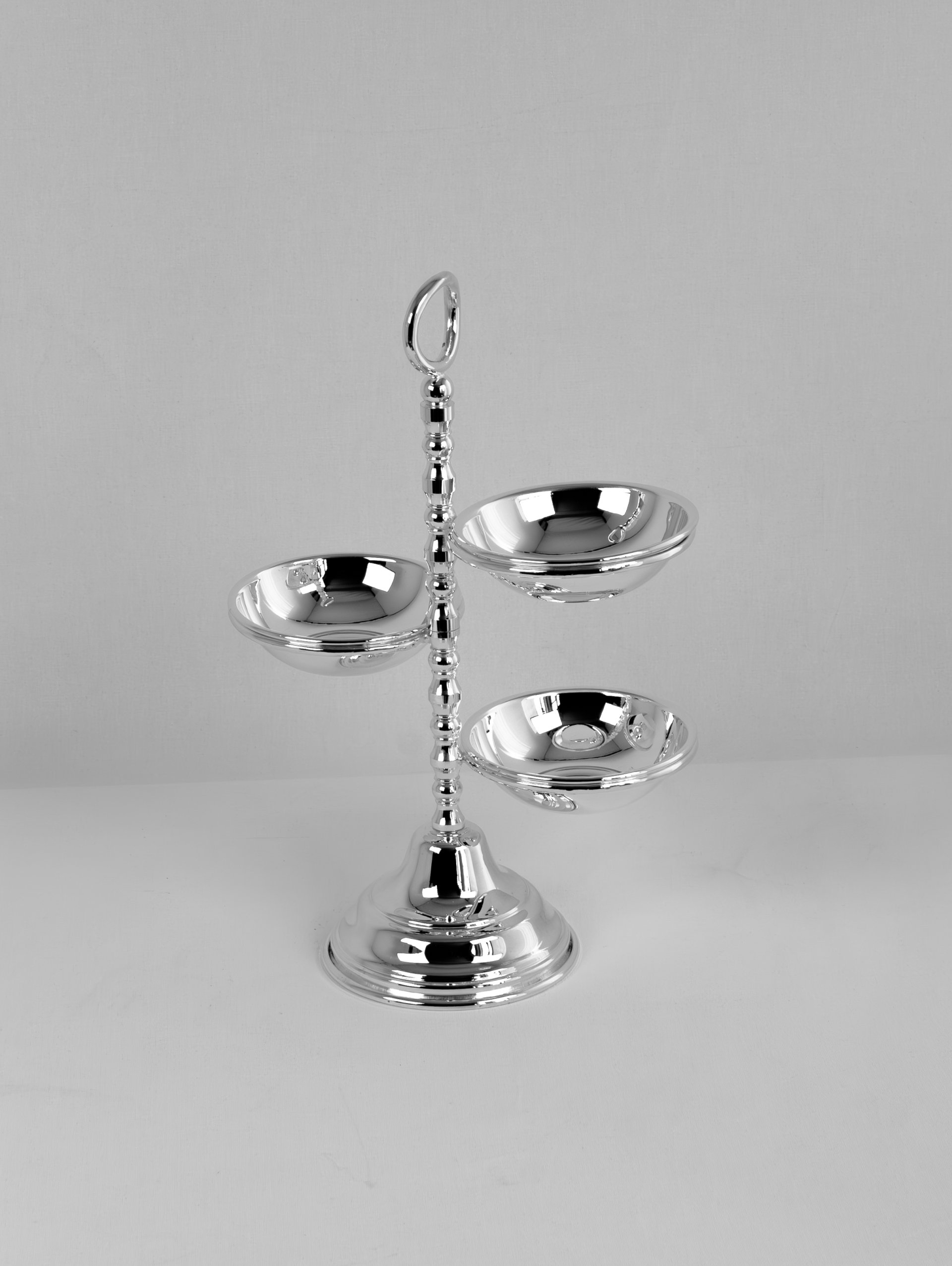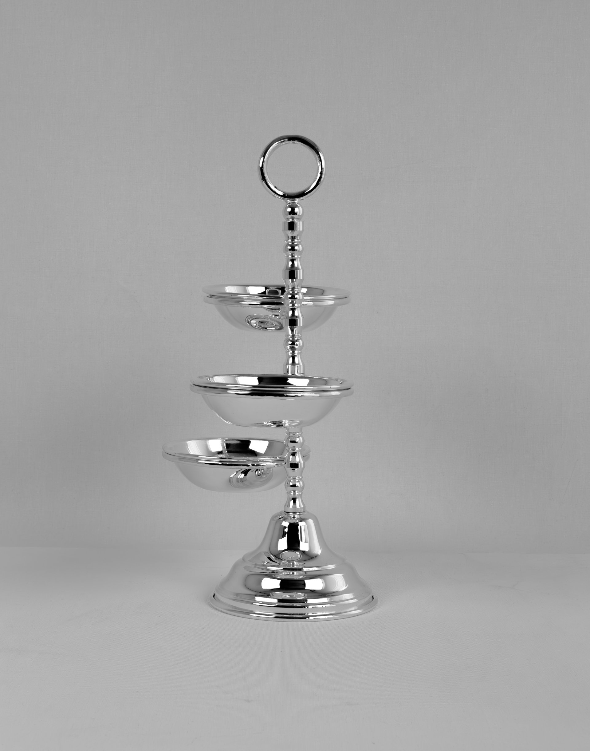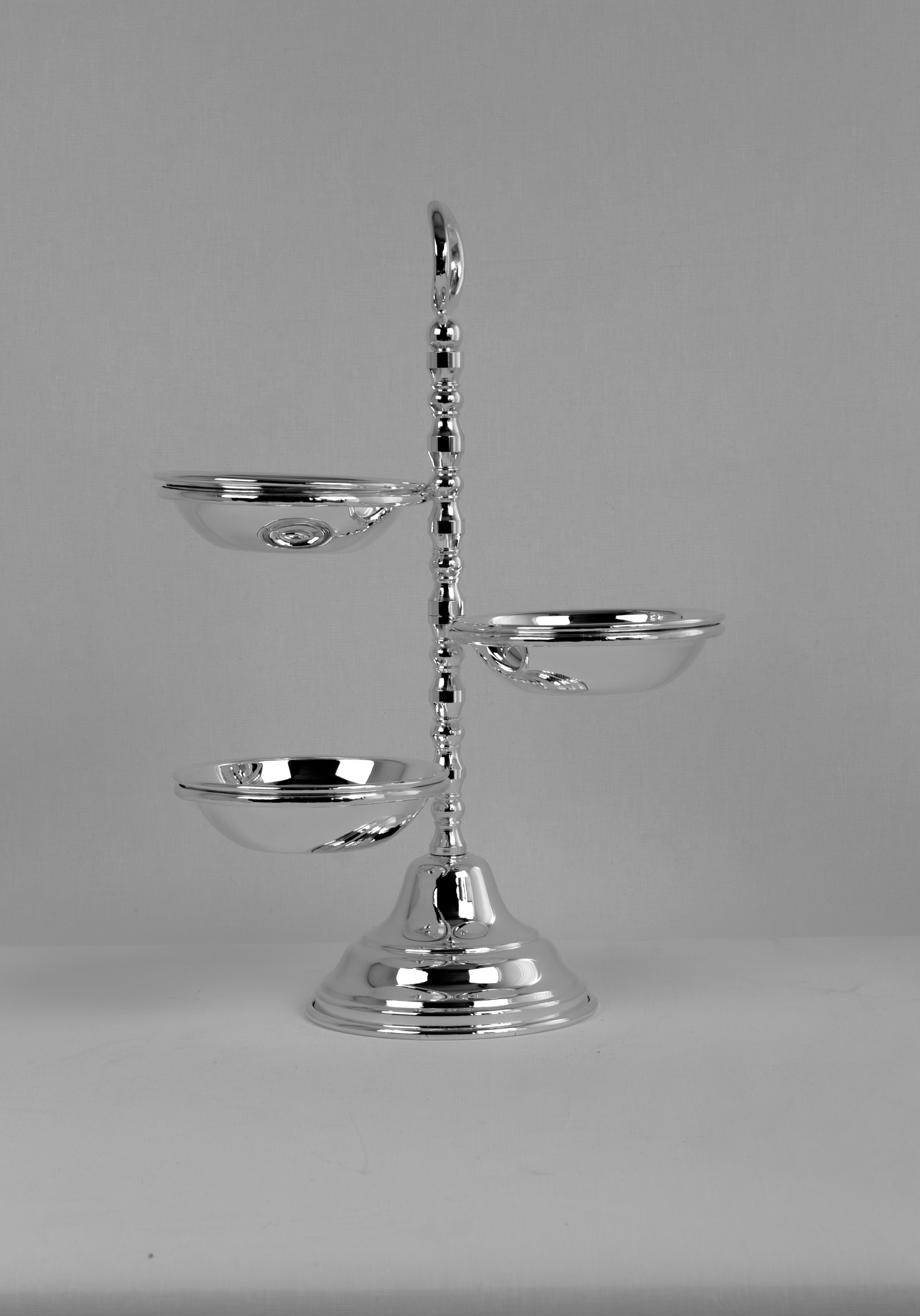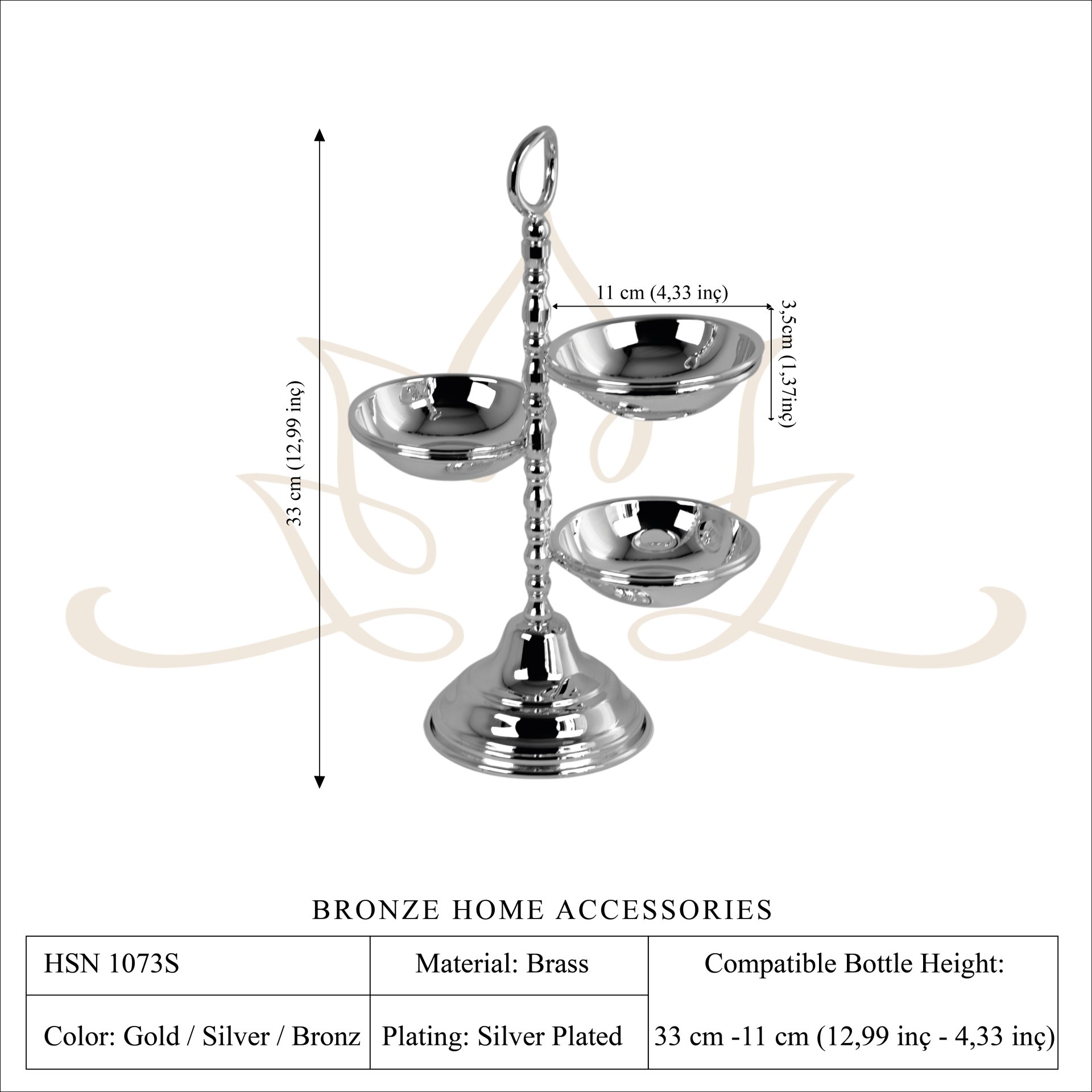 This elegant serving stand is handcrafted from solid brass and designed to present snacks and small treats in a refined and stylish way. The stand features three polished brass bowls arranged around a decorative central column, creating a balanced and visually appealing serving piece.