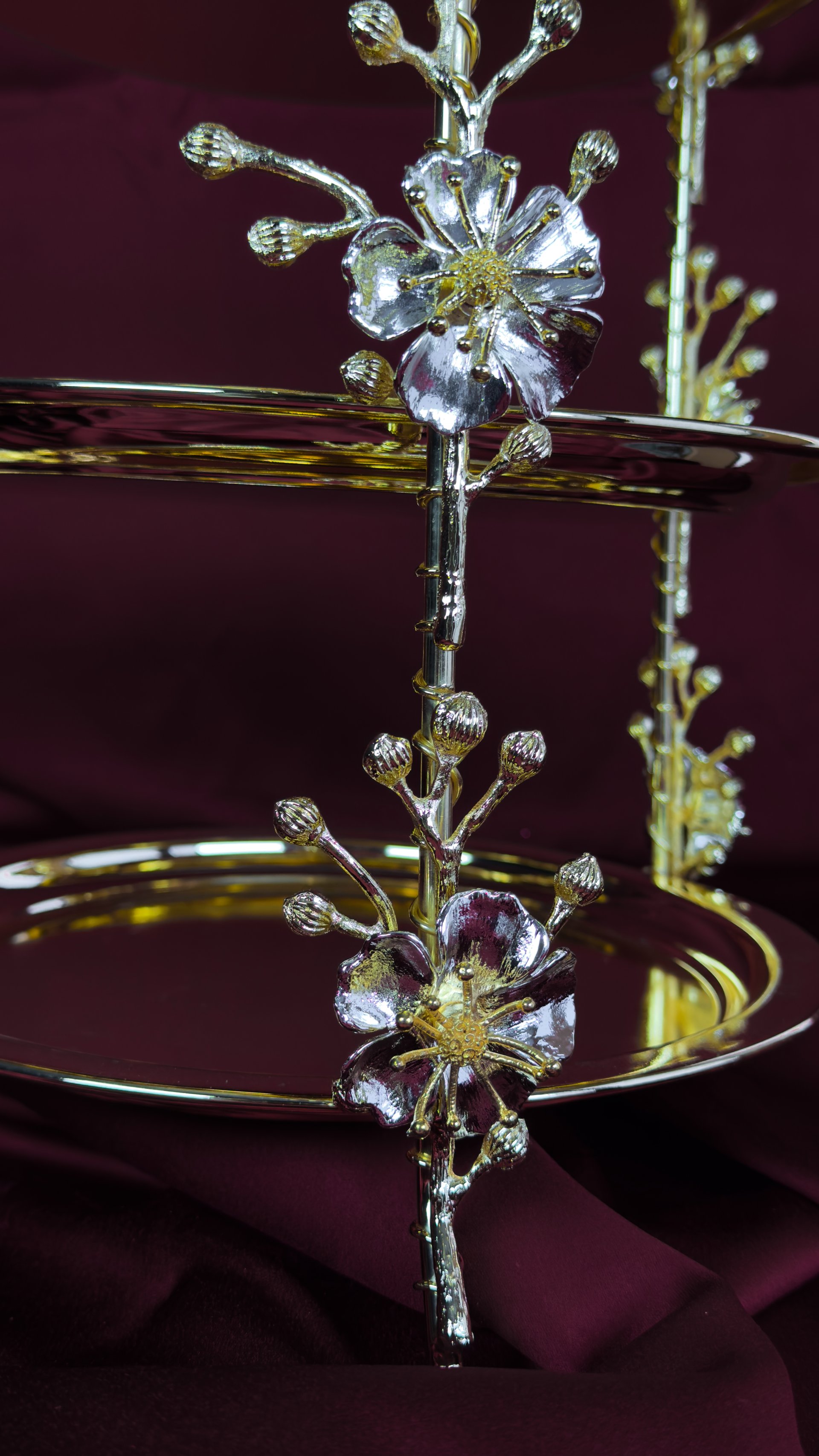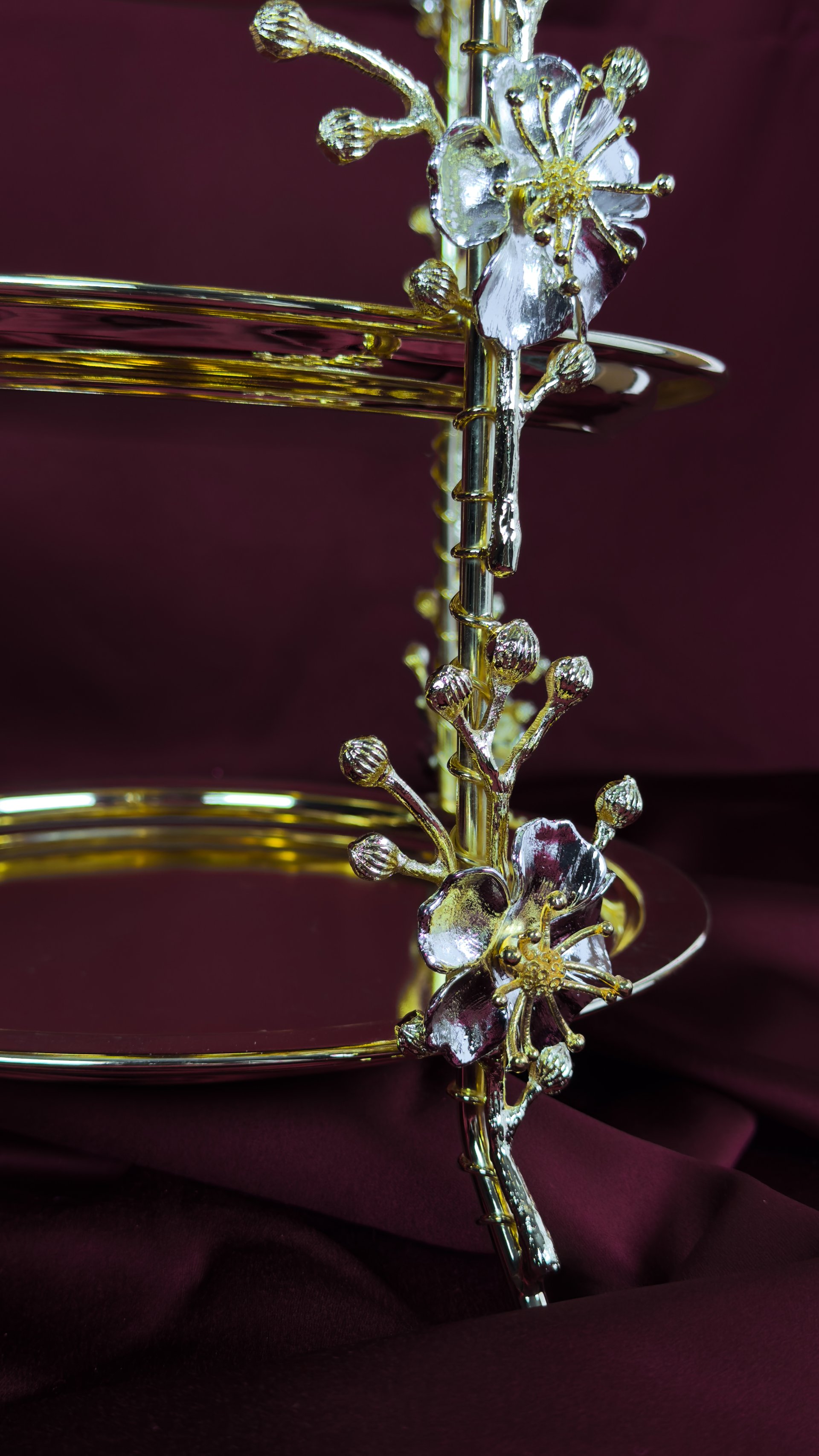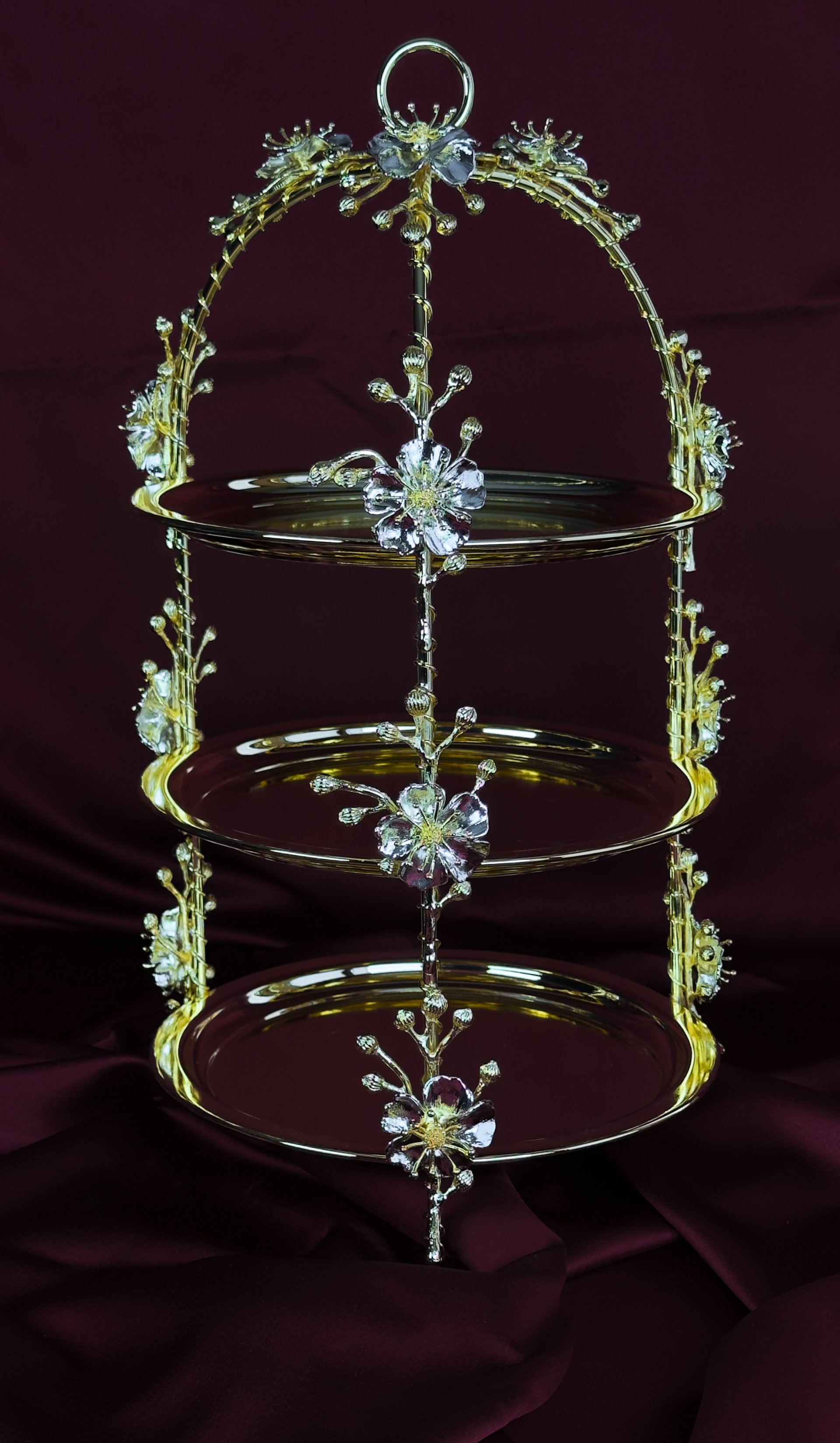 This handmade brass three tier serving stand is designed to elevate table presentation with a refined and decorative presence. The elegant structure features delicate floral details that frame each tier, creating a graceful balance between functionality and ornamental design. The flowing lines and handcrafted elements give the piece a distinctive character that reflects traditional metal craftsmanship.