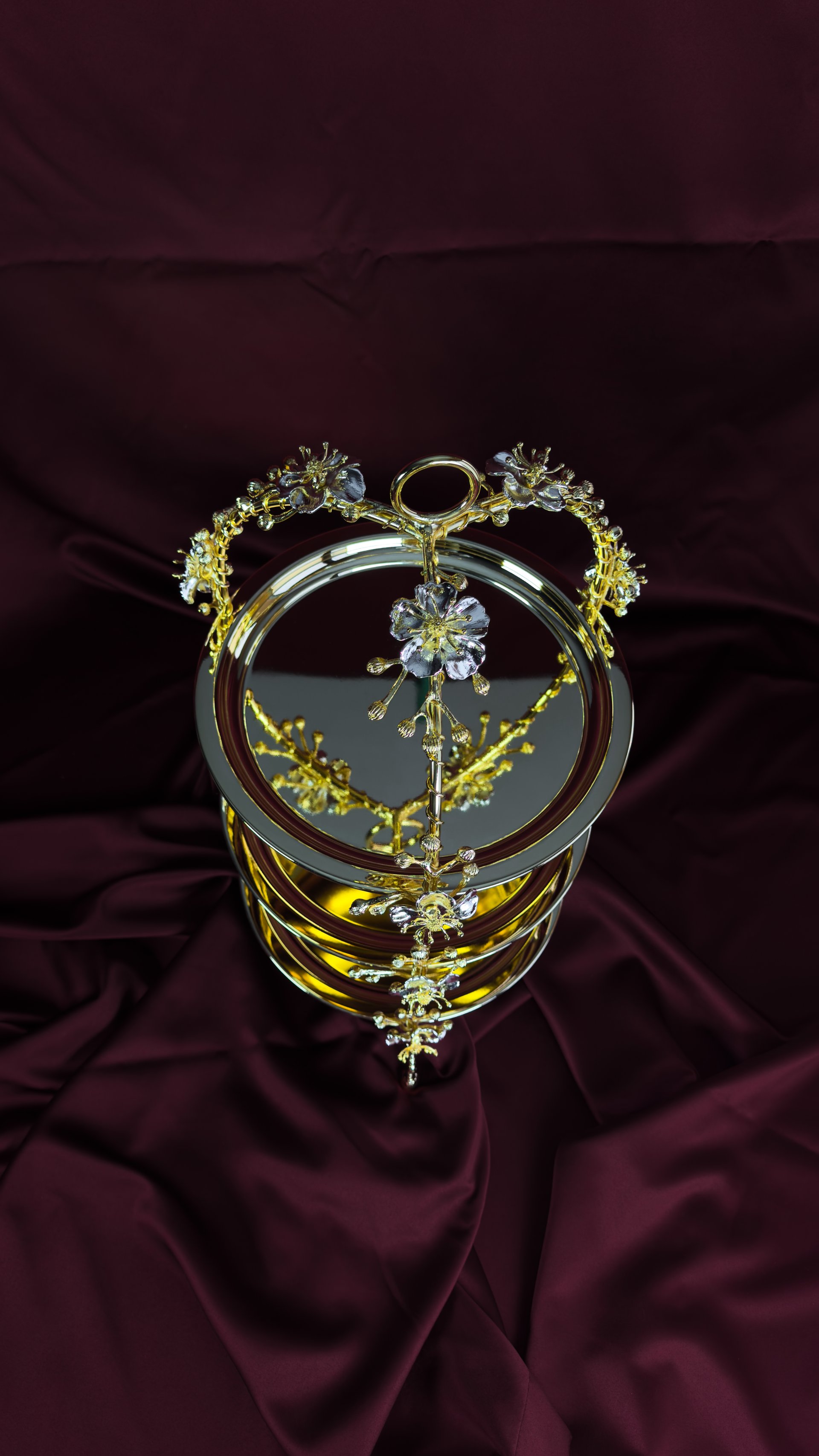 Produced using artisanal techniques, each serving stand carries subtle variations that highlight its handmade nature. The multi tier design allows desserts, pastries, fruits, and appetizers to be displayed beautifully while saving space on the table. The sculptural handle and decorative frame add a sophisticated touch, making it both a functional serving piece and an elegant centerpiece.