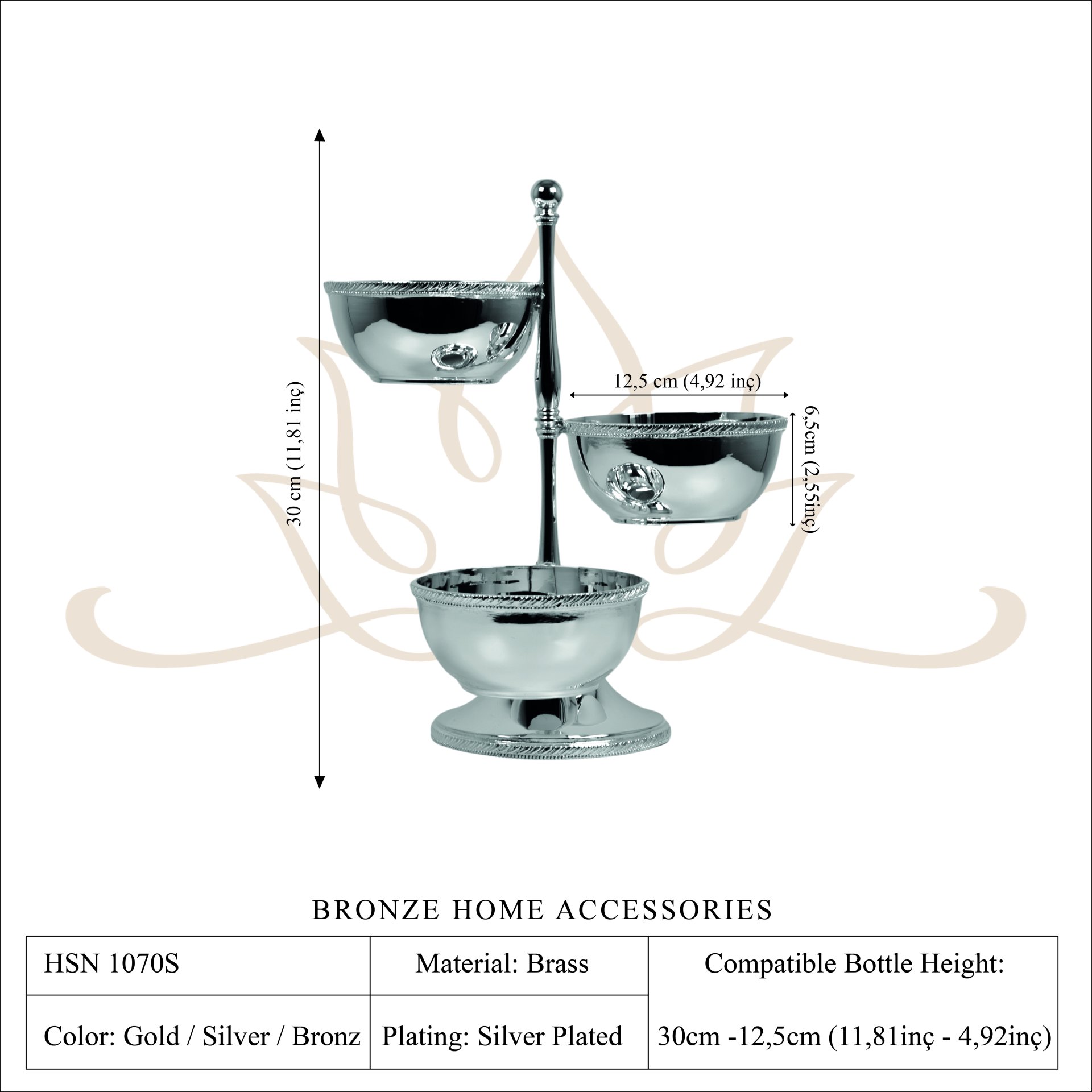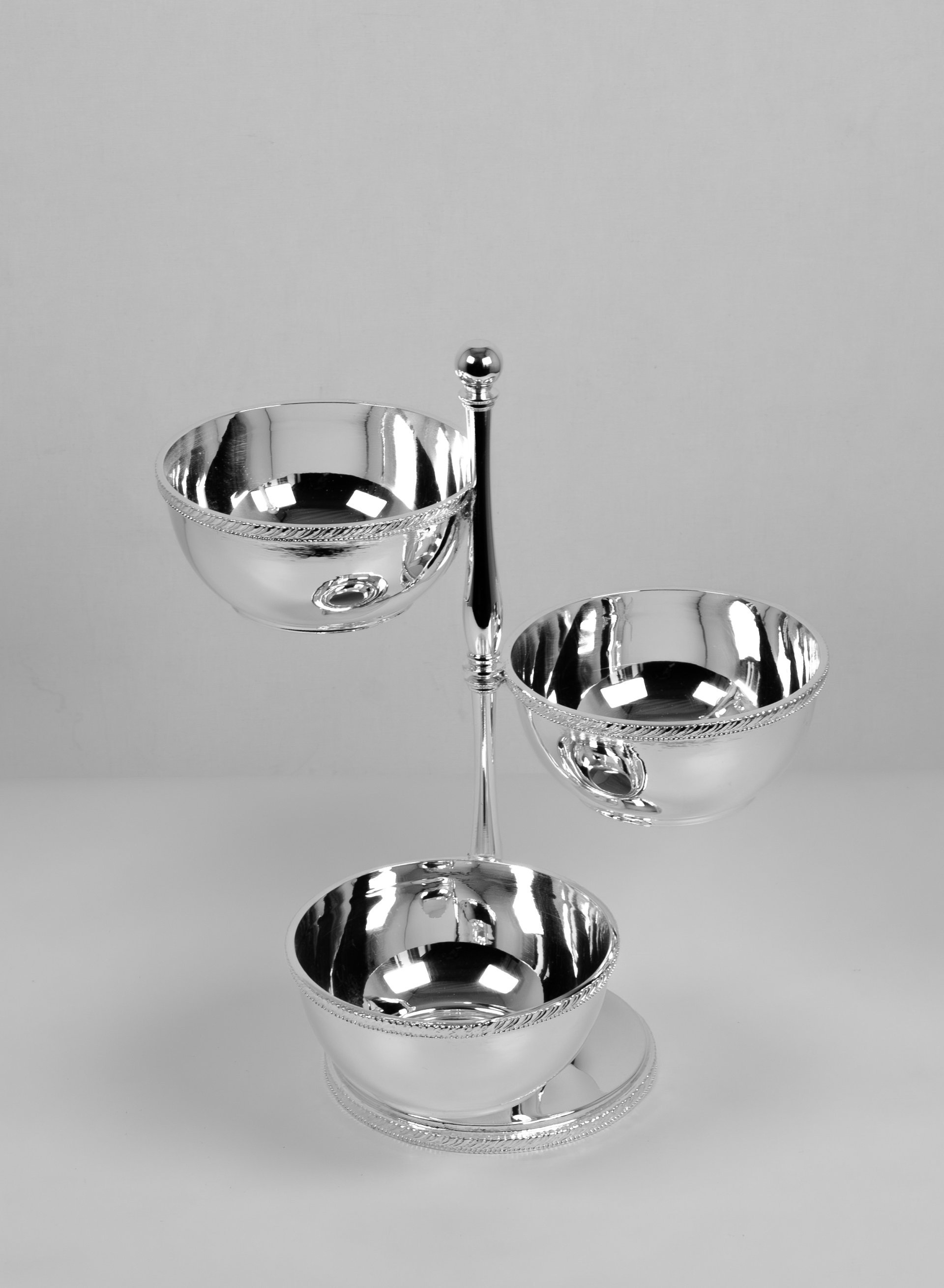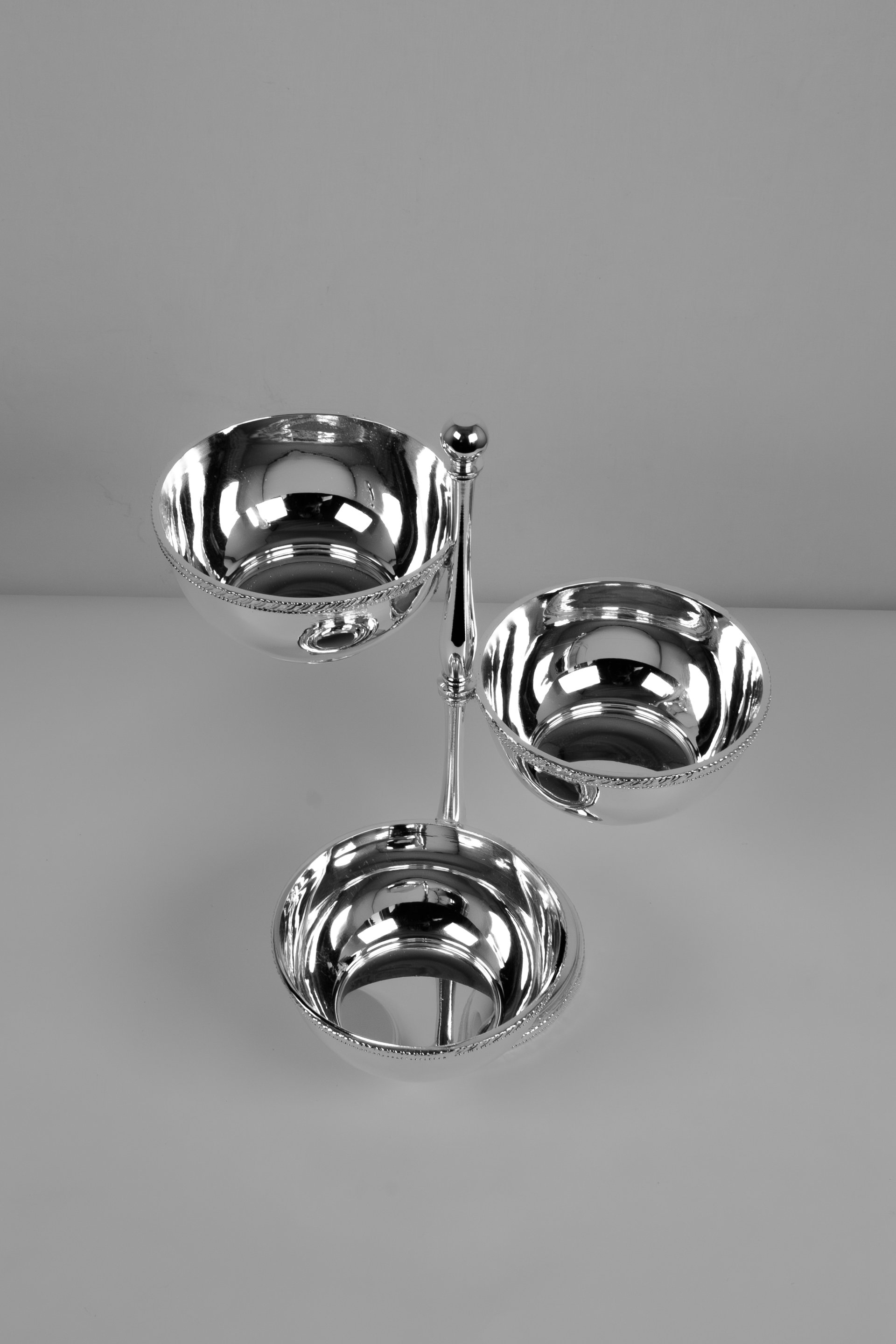 This elegant serving stand is handcrafted from solid brass and designed to present snacks and small treats in a refined and organized way. The piece features three polished bowls positioned at different heights around a central column, creating a visually balanced and stylish serving arrangement.