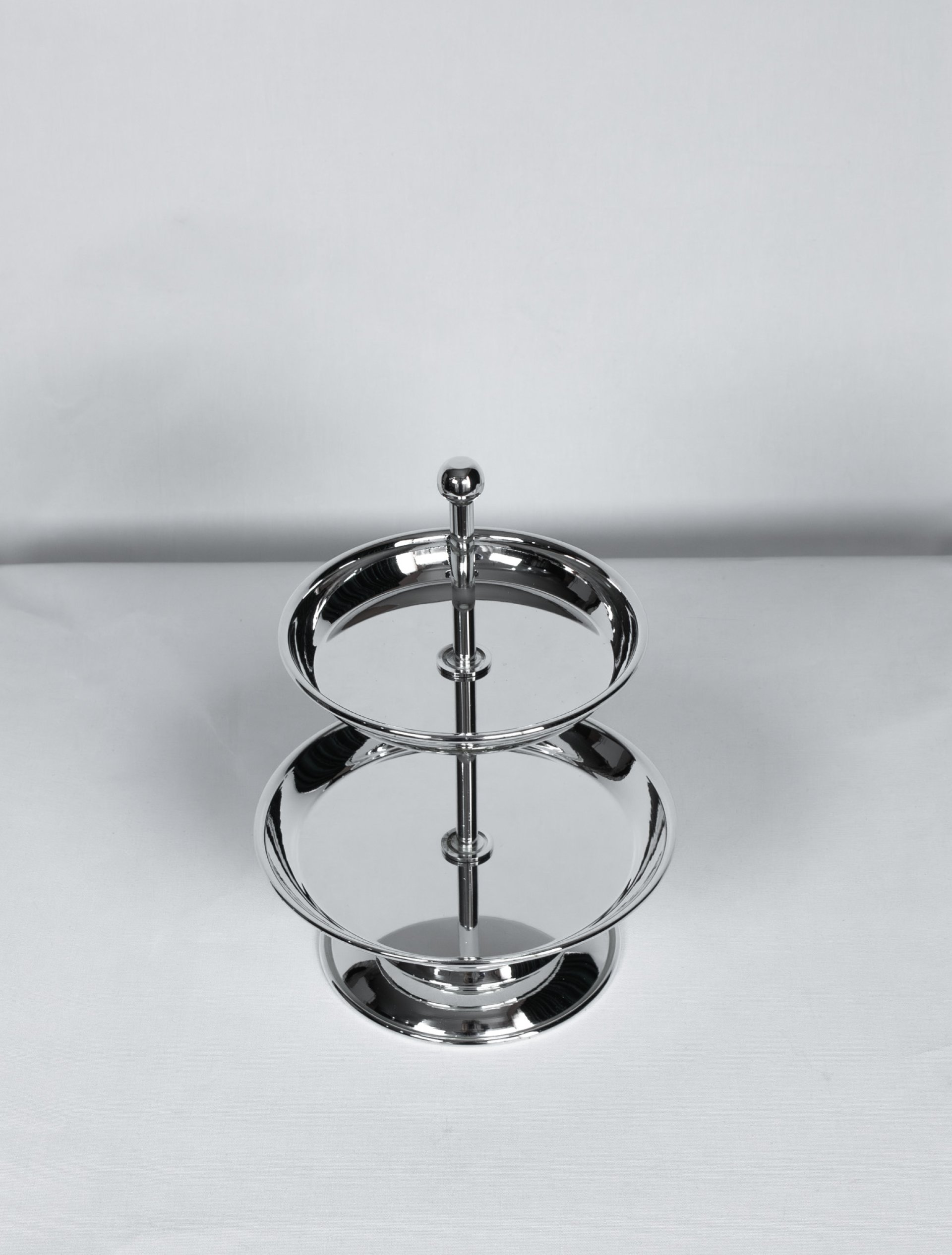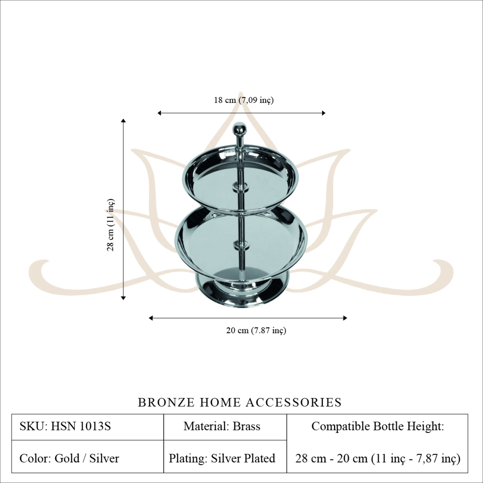 This elegant two tier dessert stand is handcrafted from solid brass by skilled artisans, combining traditional craftsmanship with timeless design. The stand features two round serving plates supported by a central column with a decorative top handle, creating a refined display for desserts and small bites.