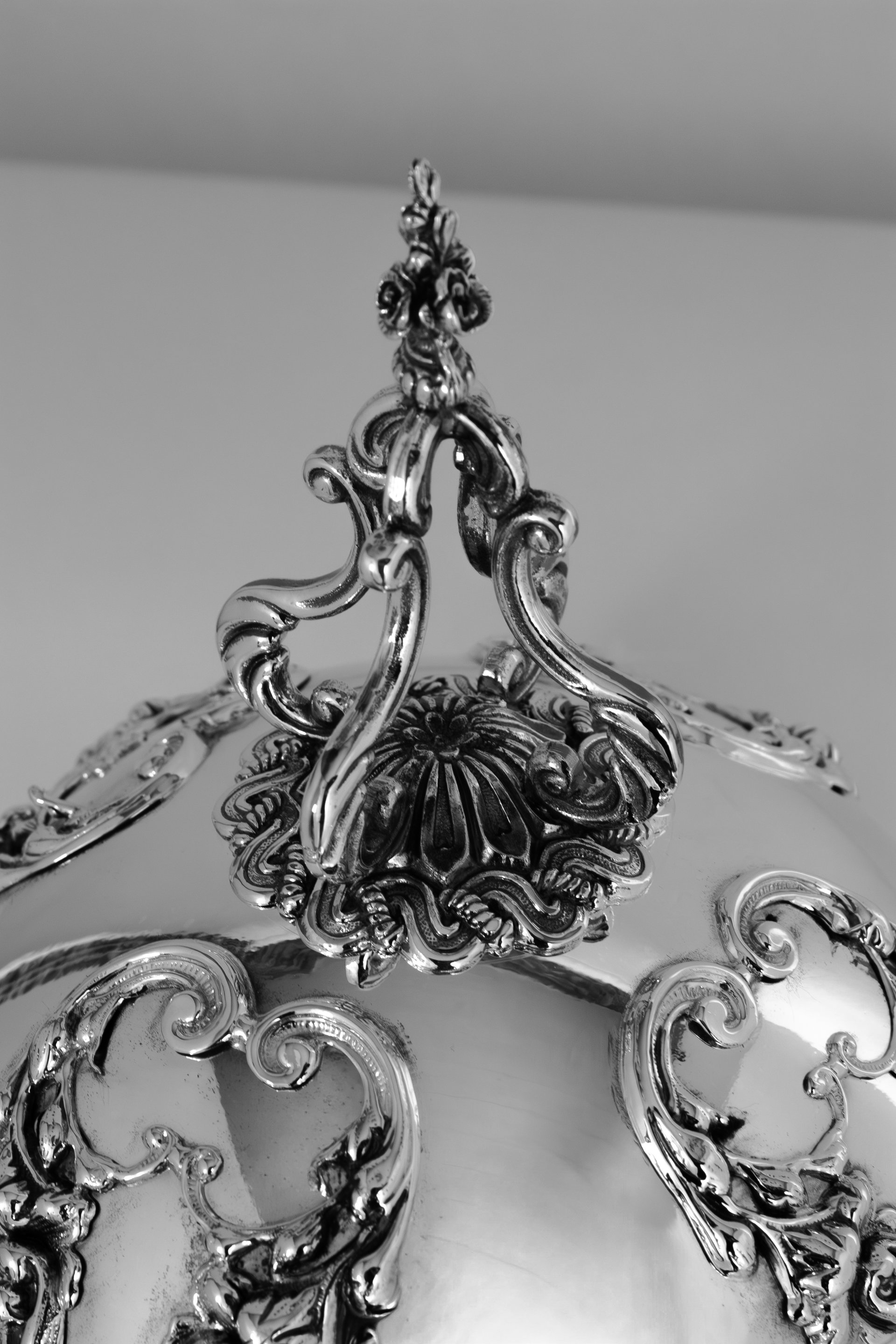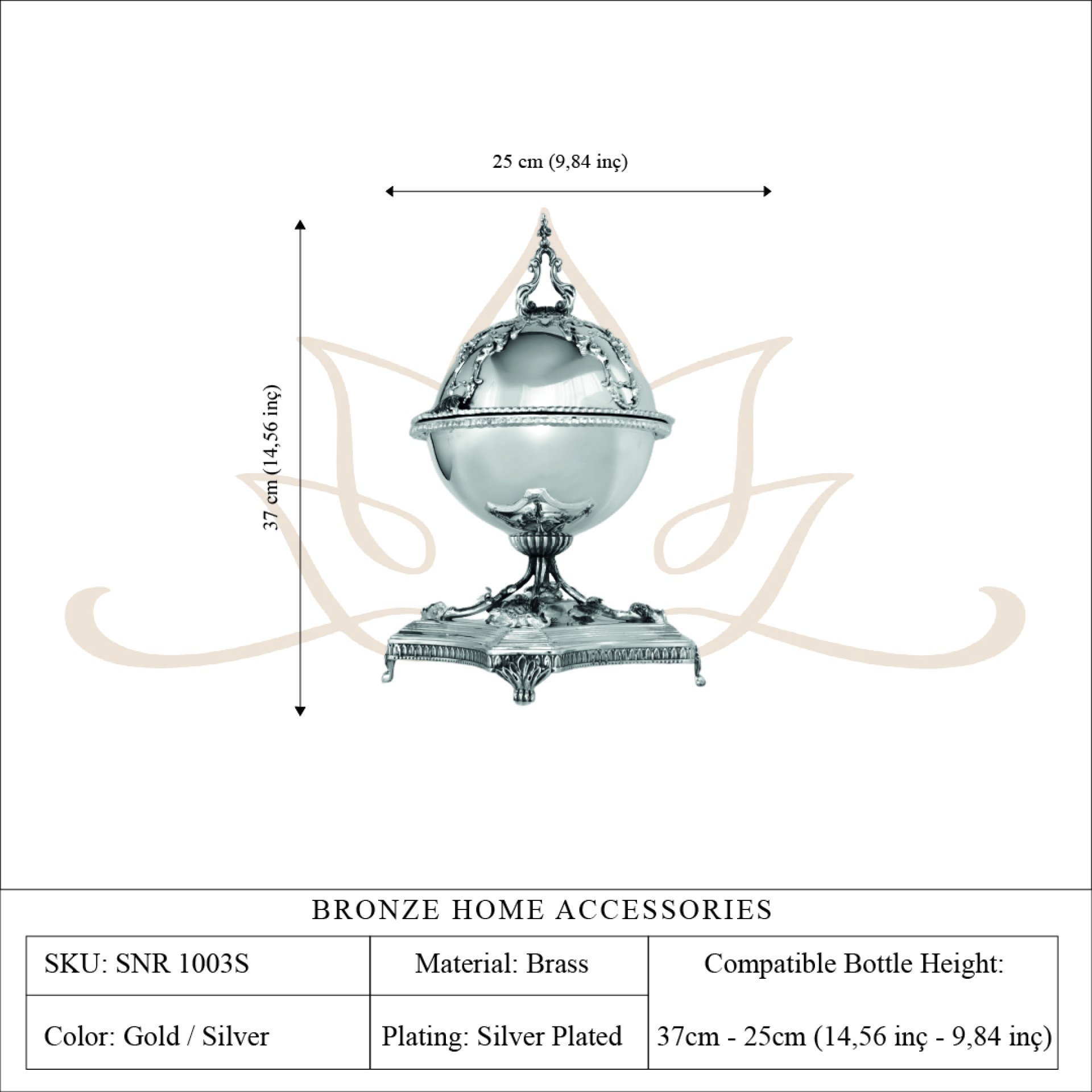 This handmade caviar stand is designed to combine elegant presentation with practical multi serving functionality. Crafted from brass and finished with silver plating, it features a rounded serving body supported by a decorative pedestal base and a smoothly opening dome lid. Inside, one large glass bowl is paired with four smaller removable bowls for organized gourmet presentation.