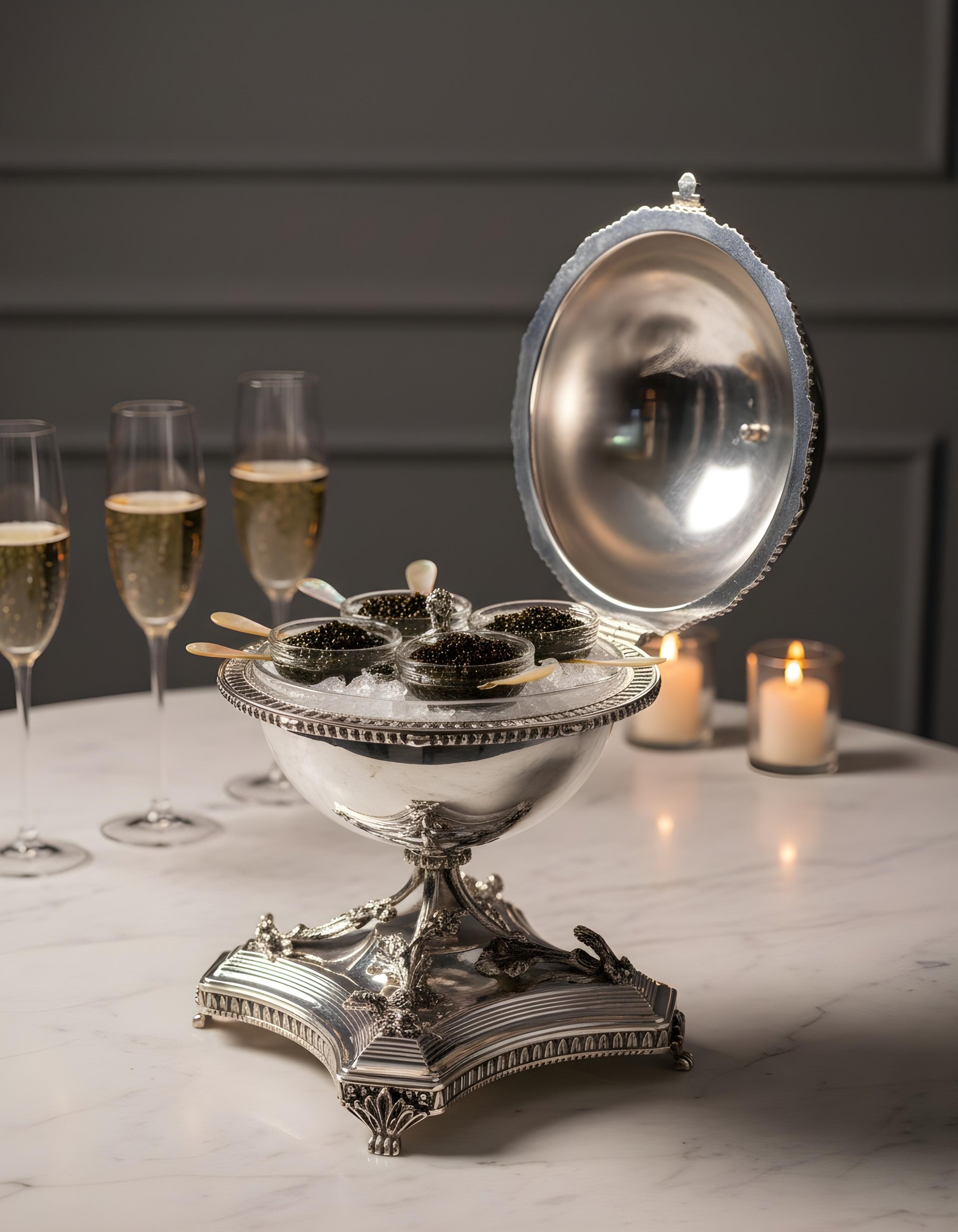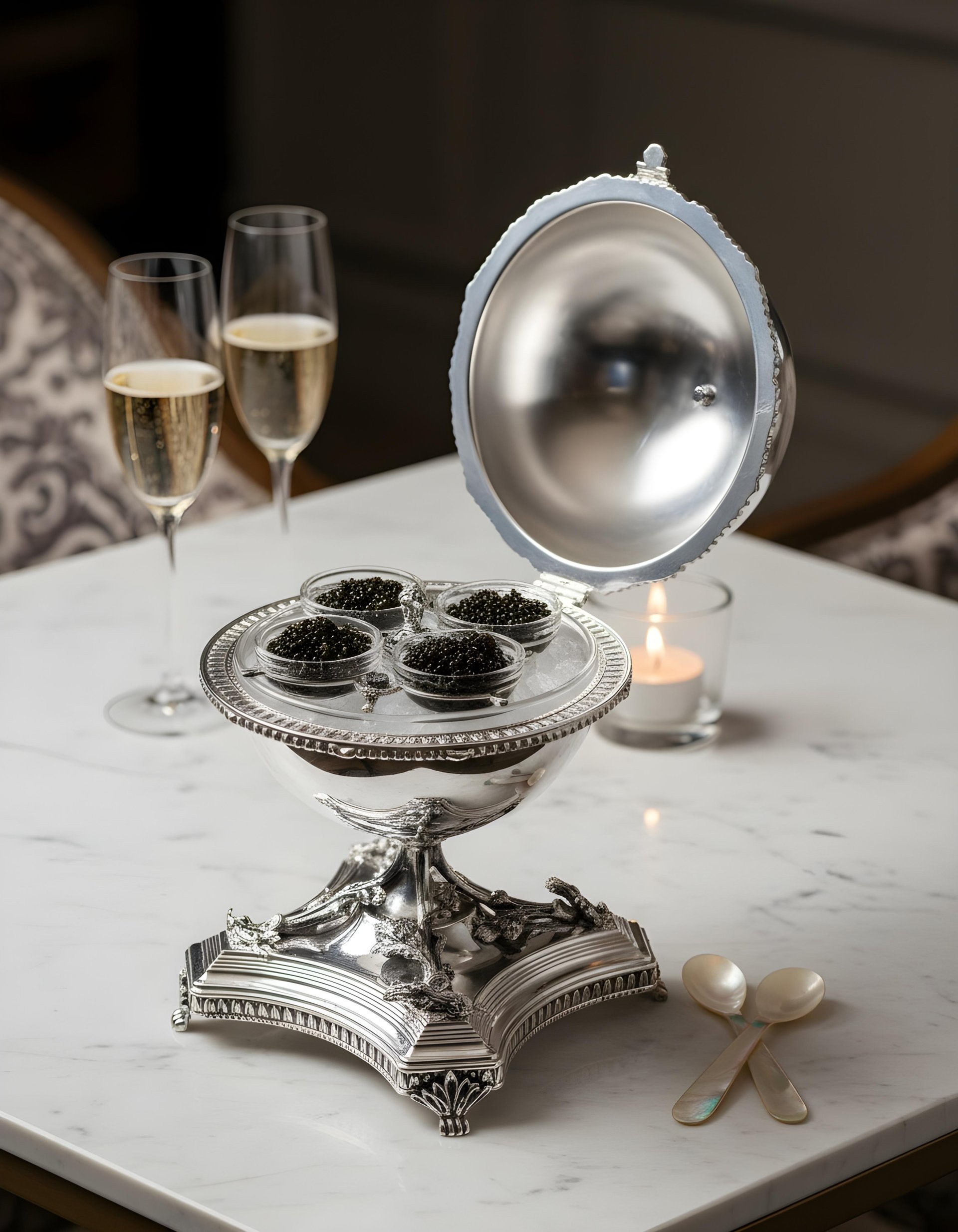 The multi bowl system allows simultaneous serving of caviar with its accompaniments in a visually balanced arrangement. Its protective lid helps maintain freshness while the structured base enhances stability, making it suitable for professional hospitality environments and refined home dining.