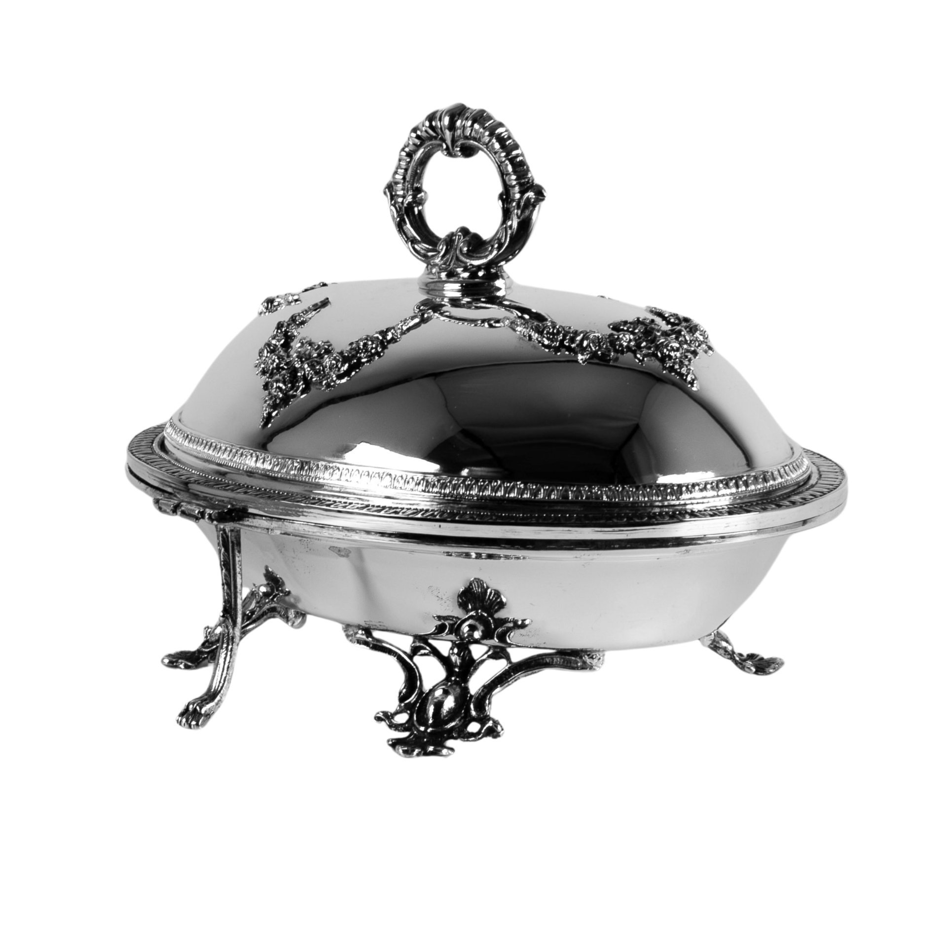 This handmade caviar stand is designed to offer an elegant multi serving presentation through its oval serving form and decorative pedestal base. Crafted from brass and finished with silver plating, it features a smoothly opening dome lid and a spacious inner serving area. Inside, three removable glass bowls allow for organized presentation of caviar and its accompaniments.